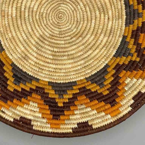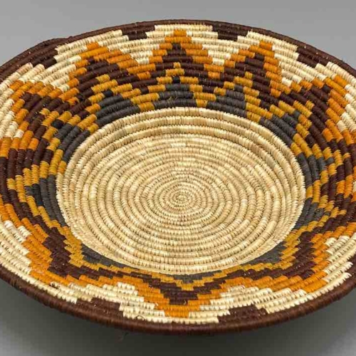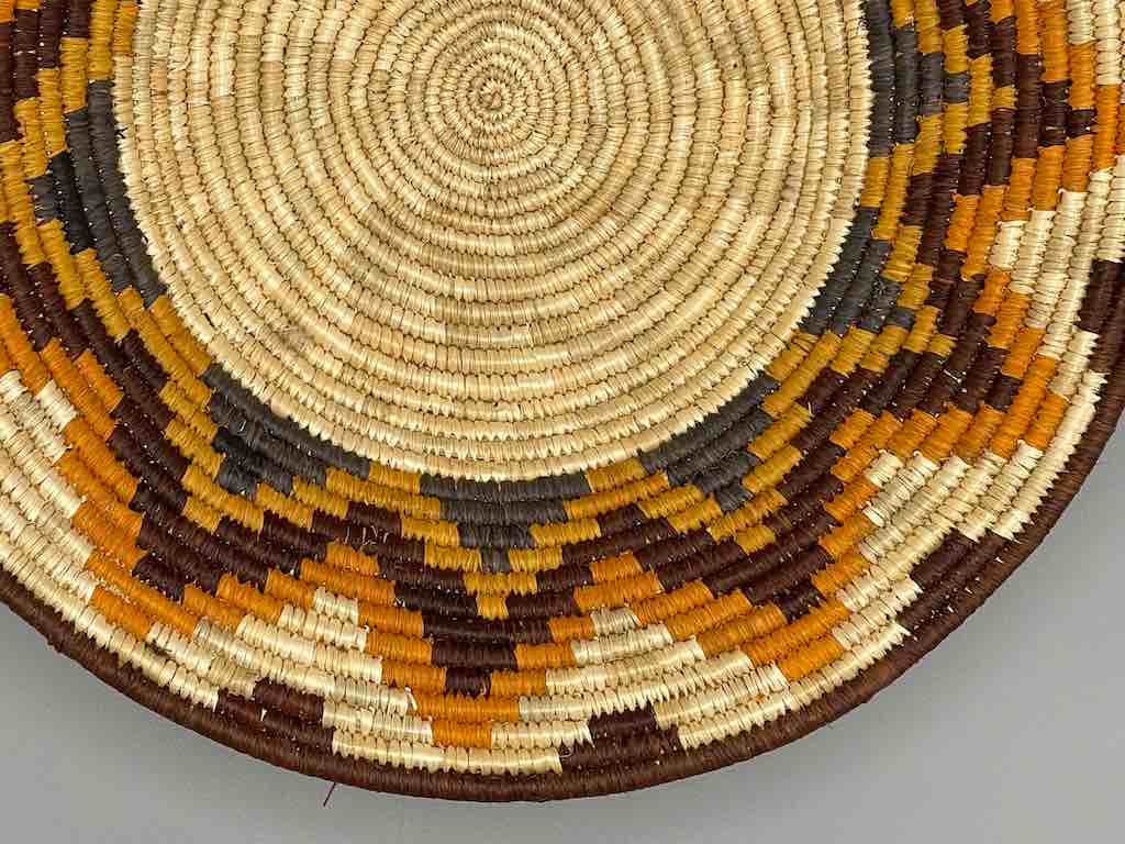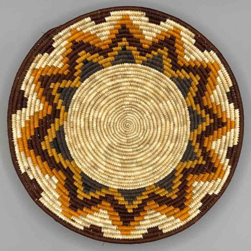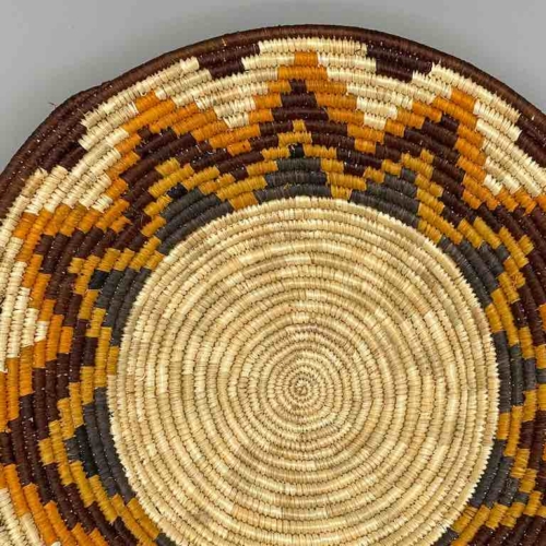 This basket/bowl is one of the thinnest coil and therefore finest quality woven basket in Africa. The design is among the most intricate, demonstrating the very advanced skill of the women of the Batoro tribe who make these in Uganda, near the Ruwenzori Mountains. This one is relatively small which affords the woman who made it to show off her exceptional basket weaving ability at a lower cost. We think these are the most beautiful and finest quality baskets we have ever seen, reflecting the unbelievable ingenuity of these amazing Ugandan artisans. Locally available natural dyes are used to create the vibrant colors which contribute to the beauty of these baskets This basket measures 11″ in diameter x 2″ deep (28 x 5 cm)
