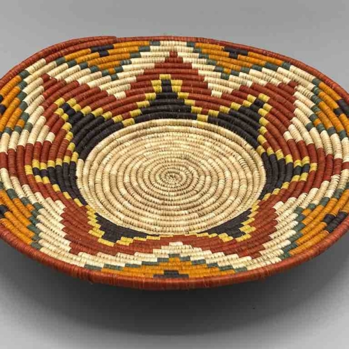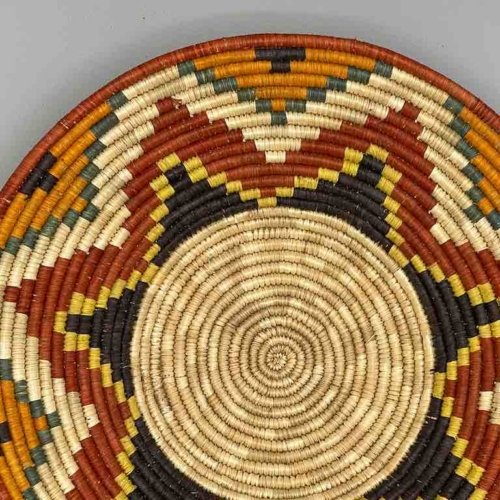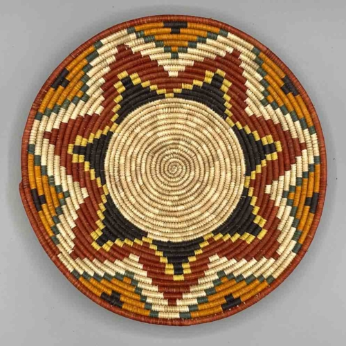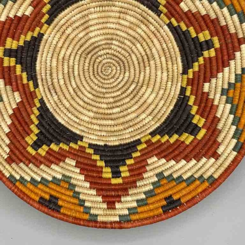This basket/bowl is one of the thinnest coil and therefore finest quality woven basket in Africa. The design is among the most intricate, demonstrating the very advanced skill of the women of the Batoro tribe who make these in Uganda, near the Ruwenzori Mountains. This one is relatively small which affords the woman who made it to show off her exceptional basket weaving ability at a lower cost. We think these are the most beautiful and finest quality baskets we have ever seen, reflecting the unbelievable ingenuity of these amazing Ugandan artisans. Locally available natural dyes are used to create the vibrant colors which contribute to the beauty of these baskets This basket measures 11 1/4″ in diameter x 2″ deep (29 x 5 cm)