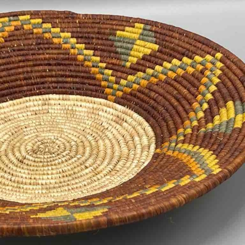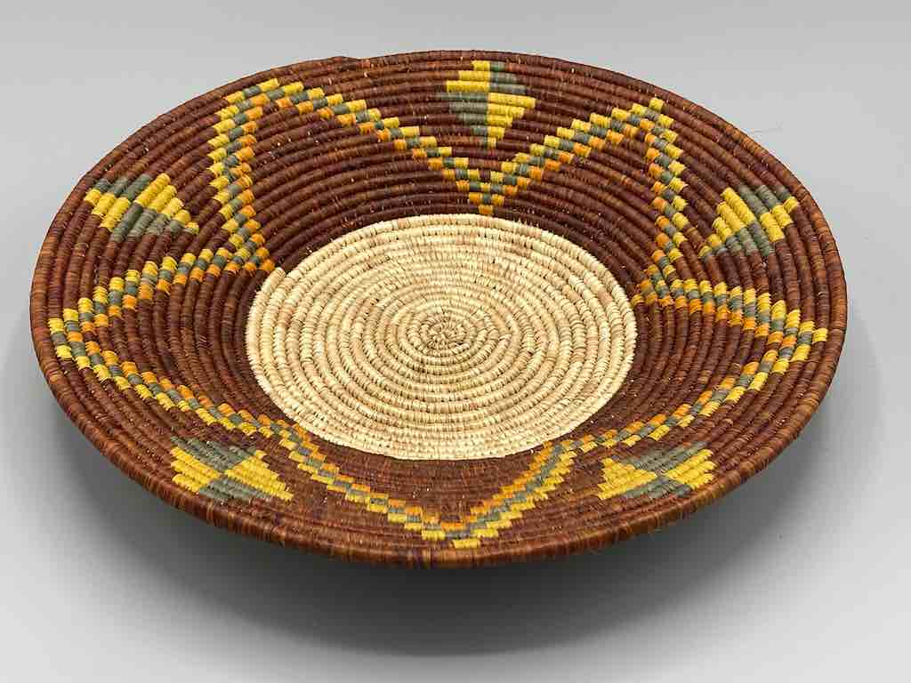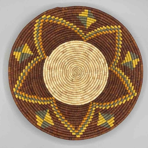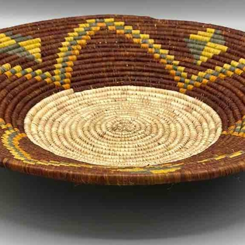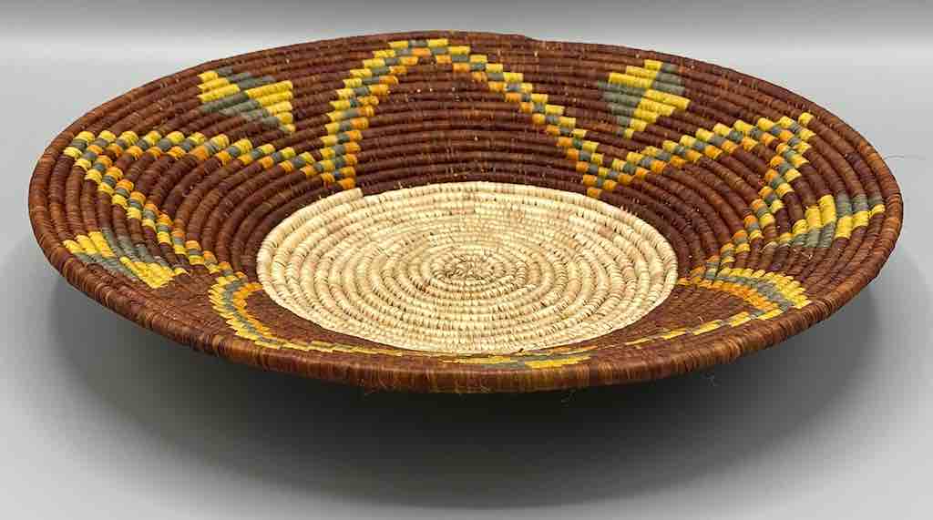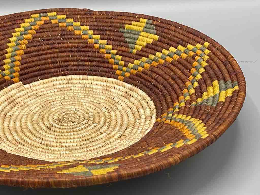 This basket/bowl is one of the thinnest coil and therefore finest quality woven basket in Africa. The design is among the most intricate, demonstrating the very advanced skill of the women of the Batoro tribe who make these in Uganda, near the Ruwenzori Mountains. This one is relatively small which affords the woman who made it to show off her exceptional basket weaving ability at a lower cost. We think these are the most beautiful and finest quality baskets we have ever seen, reflecting the unbelievable ingenuity of these amazing Ugandan artisans. Locally available natural dyes are used to create the vibrant colors which contribute to the beauty of these baskets This basket measures 11 1/2″ in diameter x 2″ deep (29 x 5 cm)