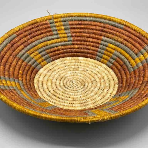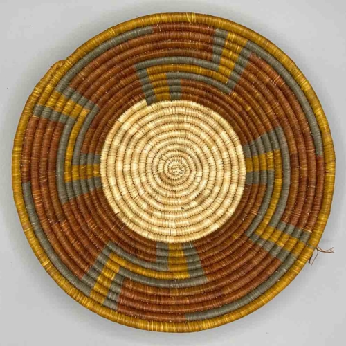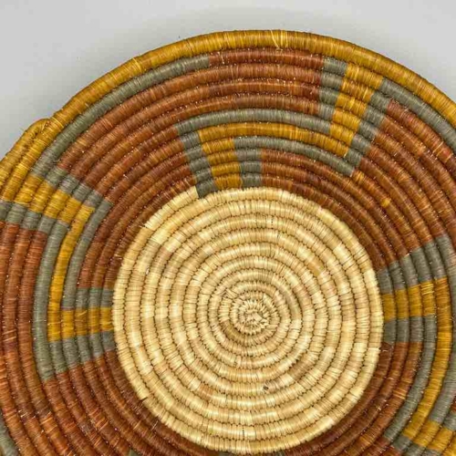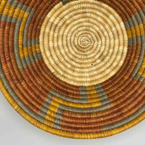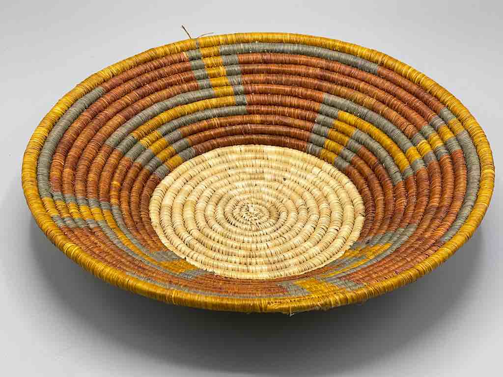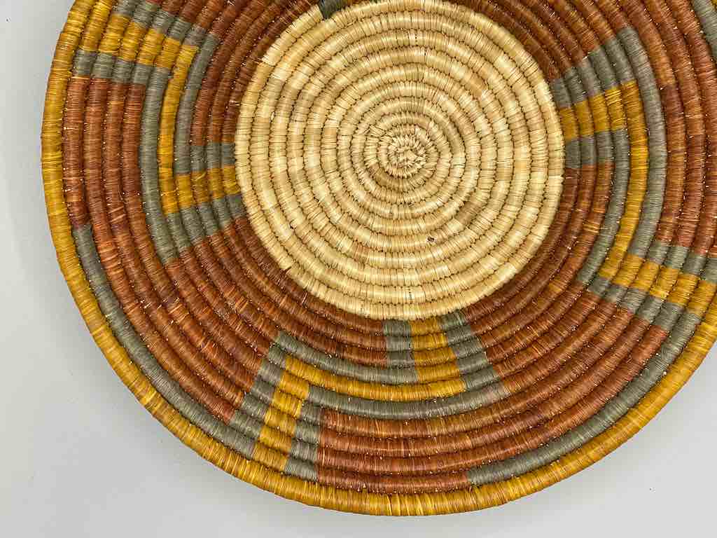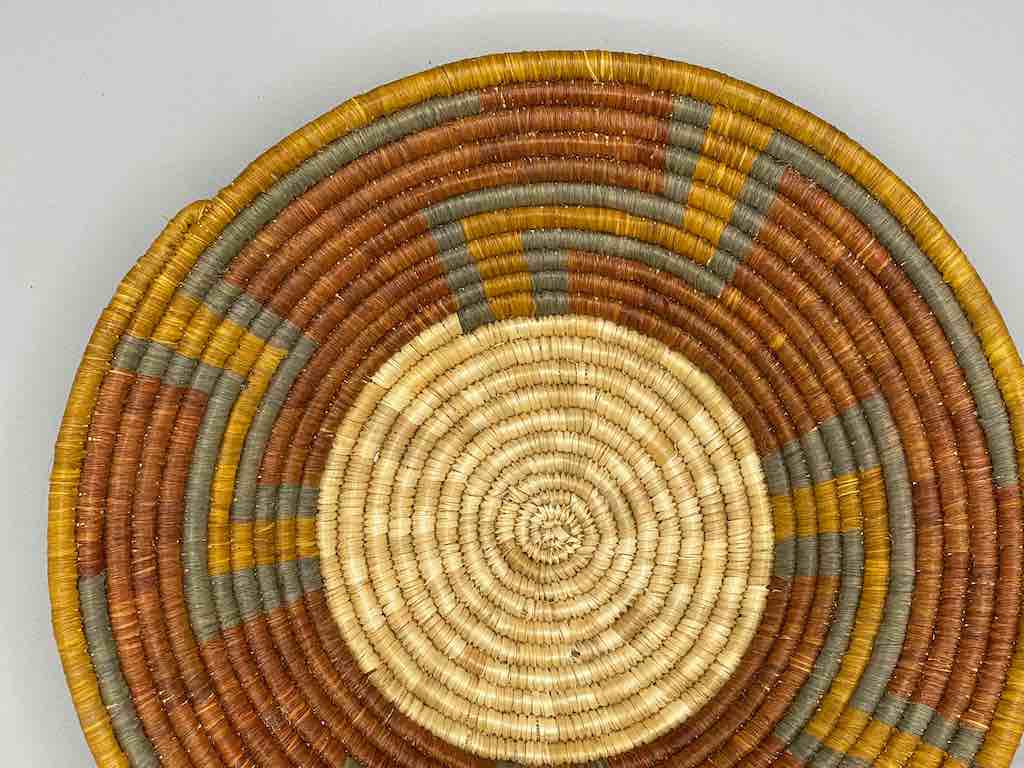 This basket/bowl is one of the thinnest coil and therefore finest quality woven basket in Africa. The design is among the most intricate, demonstrating the very advanced skill of the women of the Batoro tribe who make these in Uganda, near the Ruwenzori Mountains. This one is relatively small which affords the woman who made it to show off her exceptional basket weaving ability at a lower cost. We think these are the most beautiful and finest quality baskets we have ever seen, reflecting the unbelievable ingenuity of these amazing Ugandan artisans. Locally available natural dyes are used to create the vibrant colors which contribute to the beauty of these baskets This basket measures 11 1/2″ in diameter x 2 1/4″ deep (29 x 6 cm)