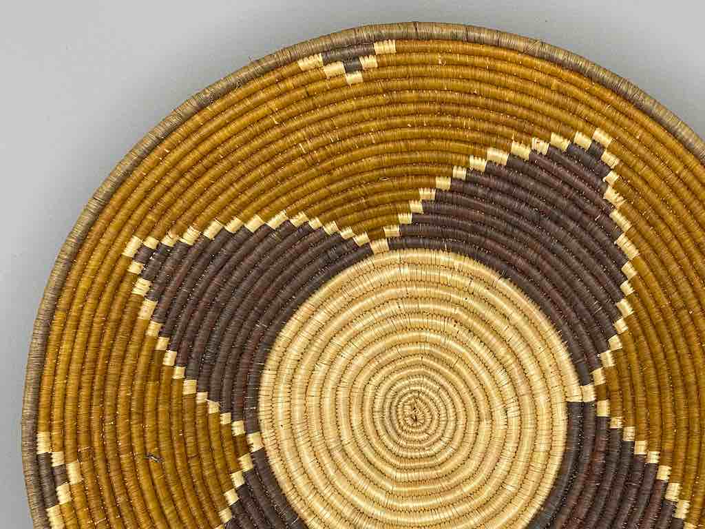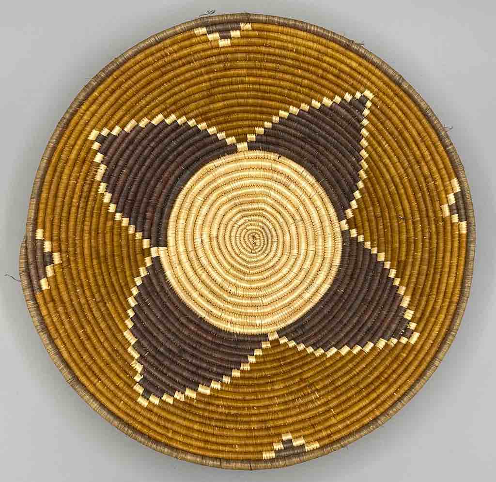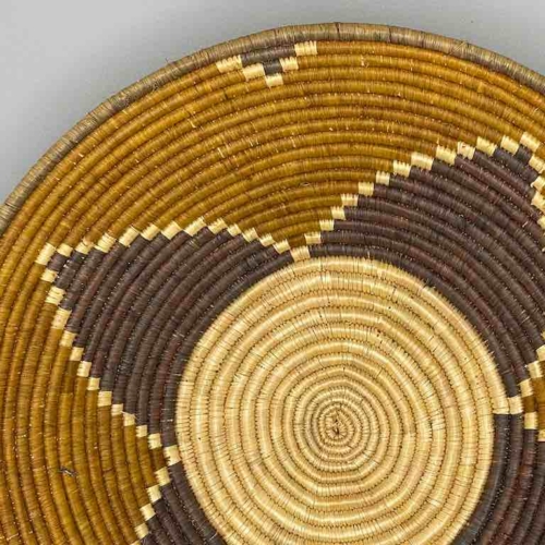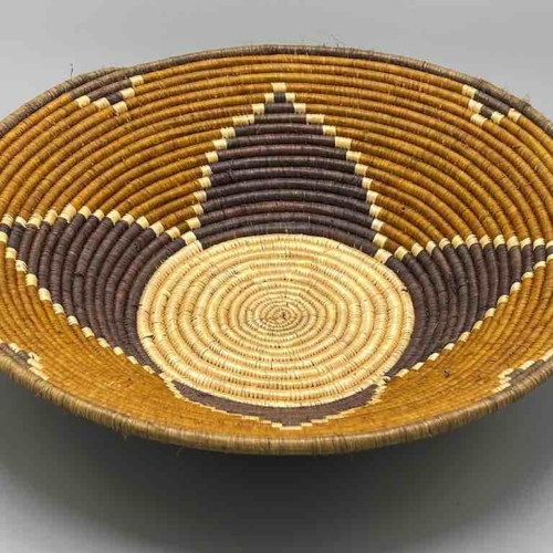 This basket/bowl is one of the thinnest coil and therefore finest quality woven basket in Africa. The design is among the most intricate, demonstrating the very advanced skill of the women of the Batoro tribe who make these in Uganda, near the Ruwenzori Mountains. This one is relatively small which affords the woman who made it to show off her exceptional basket weaving ability at a lower cost. We think these are the most beautiful and finest quality baskets we have ever seen, reflecting the unbelievable ingenuity of these amazing Ugandan artisans. Locally available natural dyes are used to create the vibrant colors which contribute to the beauty of these baskets This basket measures 12 1/8″ in diameter x 3″ deep (31 x 8 cm)