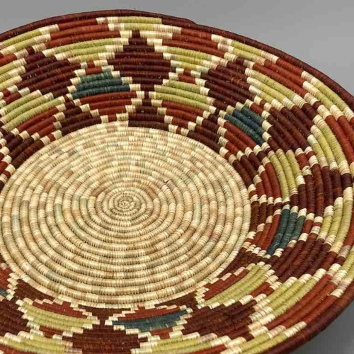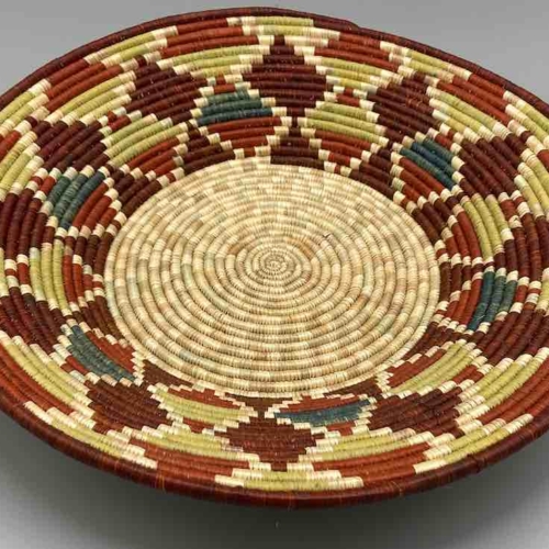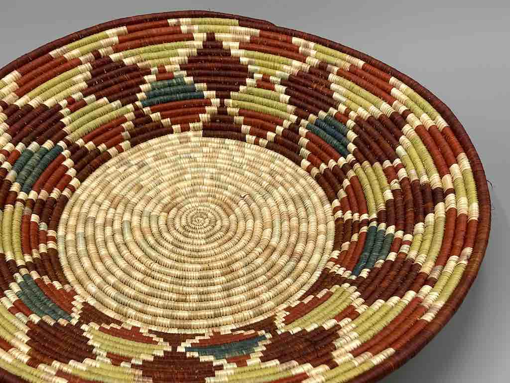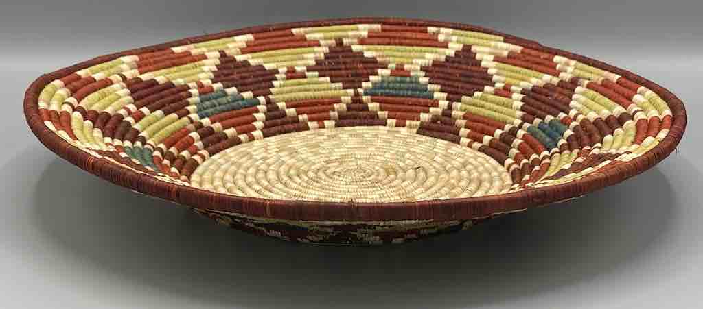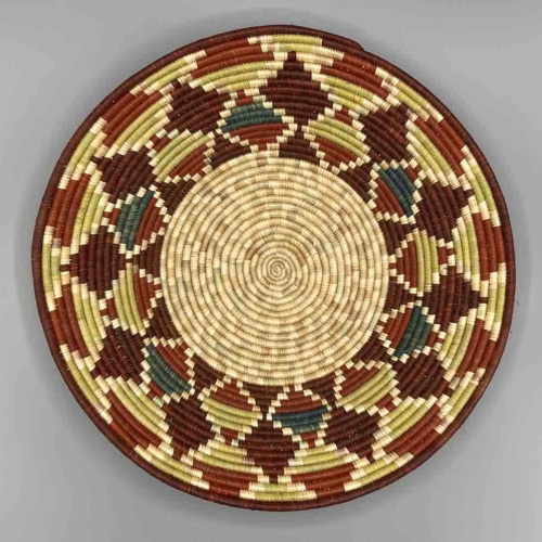 This basket/bowl is one of the thinnest coil and therefore finest quality woven basket in Africa. The design is among the most intricate, demonstrating the very advanced skill of the women of the Batoro tribe who make these in Uganda, near the Ruwenzori Mountains. This one is relatively small which affords the woman who made it to show off her exceptional basket weaving ability at a lower cost. We think these are the most beautiful and finest quality baskets we have ever seen, reflecting the unbelievable ingenuity of these amazing Ugandan artisans. Locally available natural dyes are used to create the vibrant colors which contribute to the beauty of these baskets This basket measures 14 1/4″ in diameter x 2 3/8″ deep (36 x 6 cm)