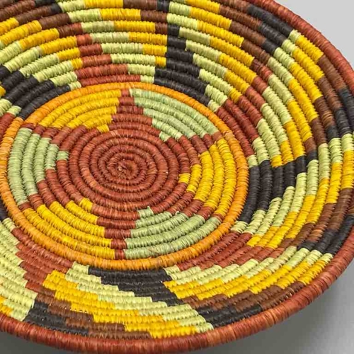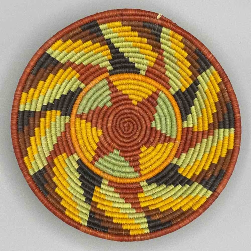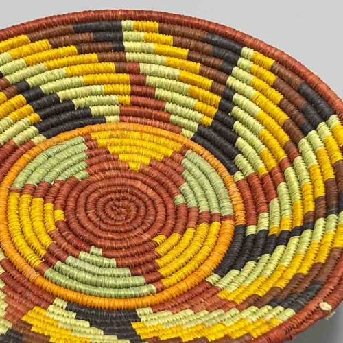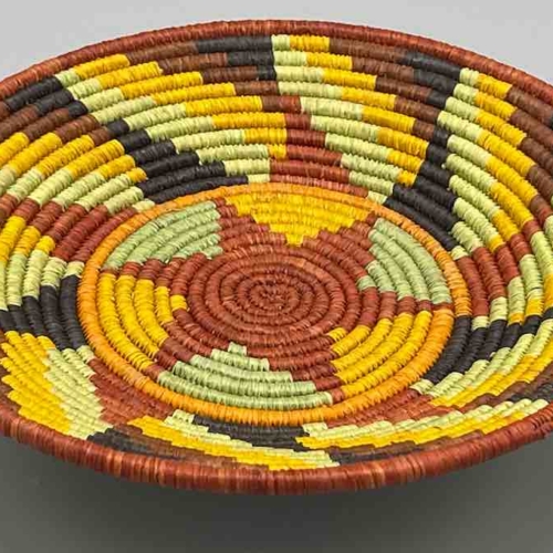 This basket/bowl is one of the thinnest coil and therefore finest quality woven basket in Africa. The design is among the most intricate, demonstrating the very advanced skill of the women of the Batoro tribe who make these in Uganda, near the Ruwenzori Mountains. This one is relatively small which affords the woman who made it to show off her exceptional basket weaving ability at a lower cost. We think these are the most beautiful and finest quality baskets we have ever seen, reflecting the unbelievable ingenuity of these amazing Ugandan artisans. Locally available natural dyes are used to create the vibrant colors which contribute to the beauty of these baskets This basket measures 6 3/4″ in diameter x 7/8″ deep (17 x 2 cm).