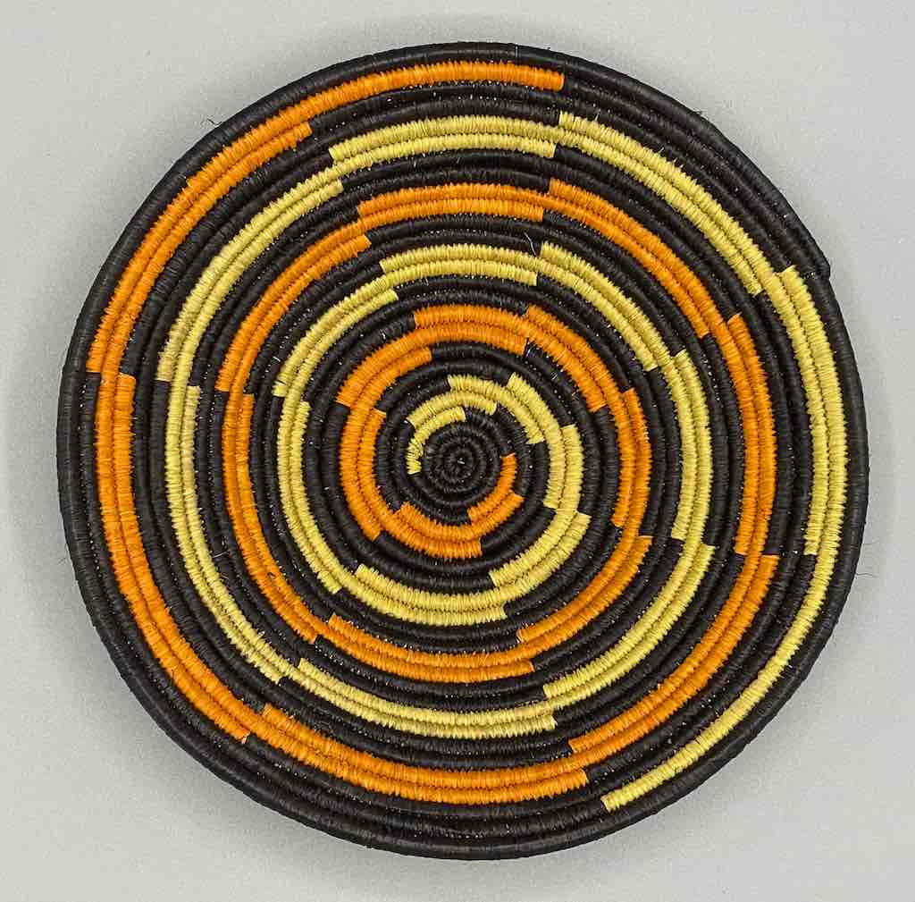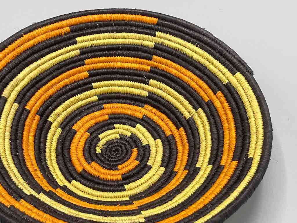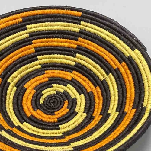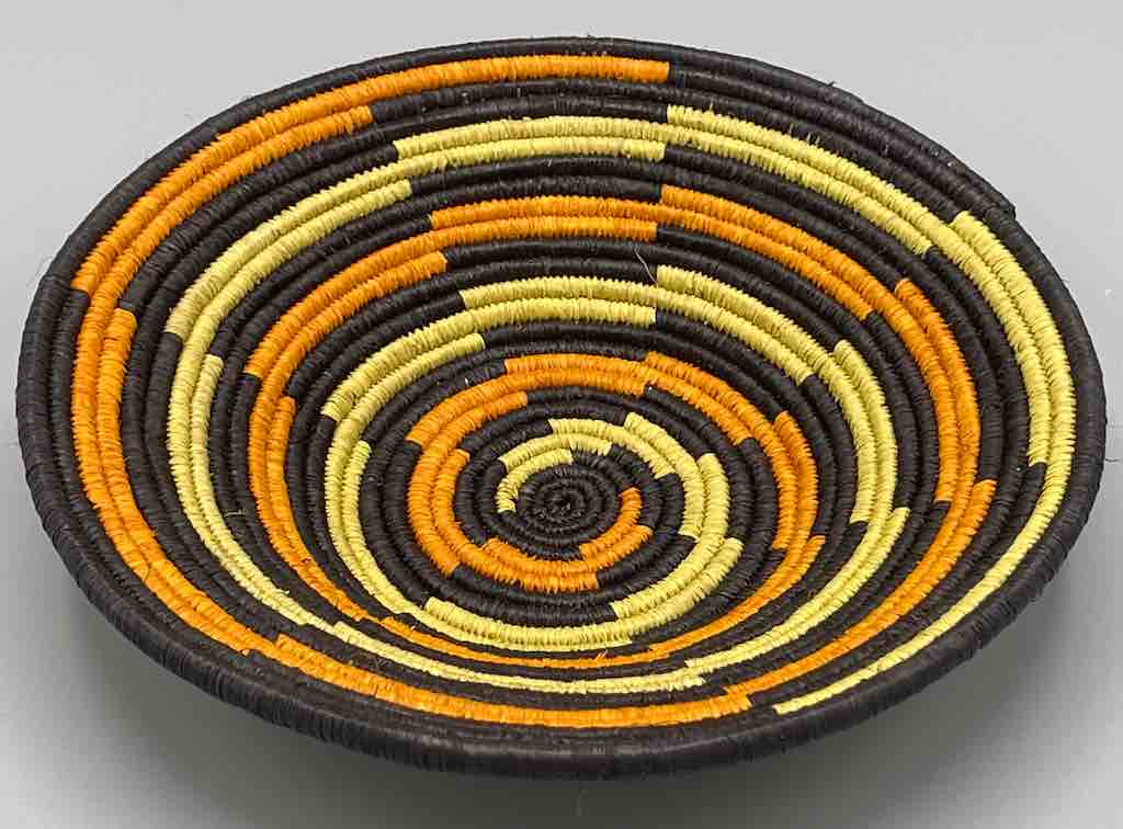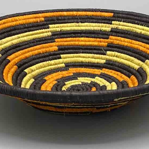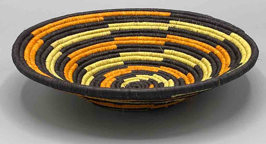 This basket/bowl is one of the thinnest coil and therefore finest quality woven basket in Africa. The design is among the most intricate, demonstrating the very advanced skill of the women of the Batoro tribe who make these in Uganda, near the Ruwenzori Mountains. This one is relatively small which affords the woman who made it to show off her exceptional basket weaving ability at a lower cost. We think these are the most beautiful and finest quality baskets we have ever seen, reflecting the unbelievable ingenuity of these amazing Ugandan artisans. Locally available natural dyes are used to create the vibrant colors which contribute to the beauty of these baskets This basket measures 7 1/4″ in diameter x 1 1/2″ deep (18 x 4 cm).