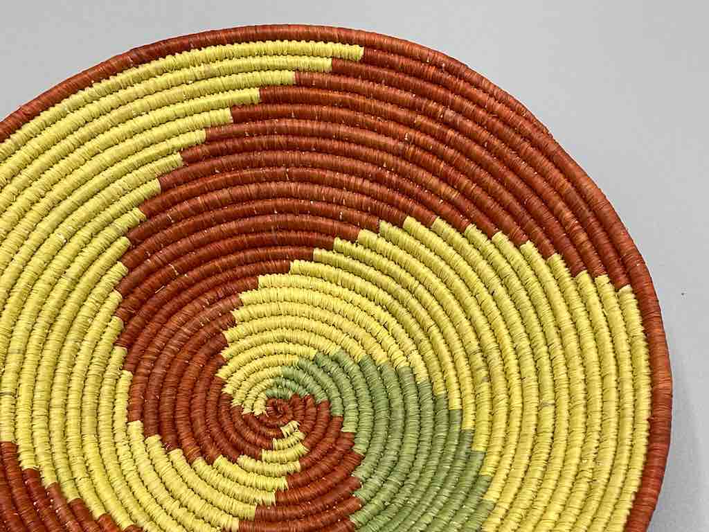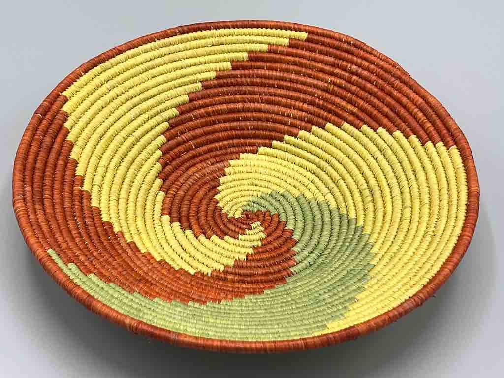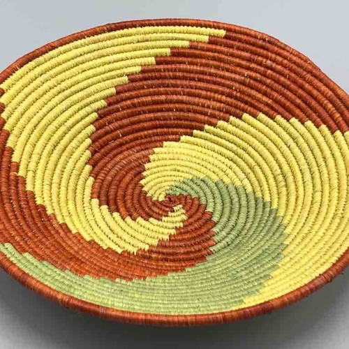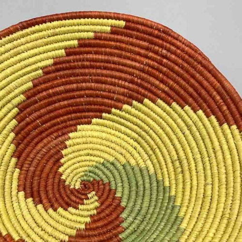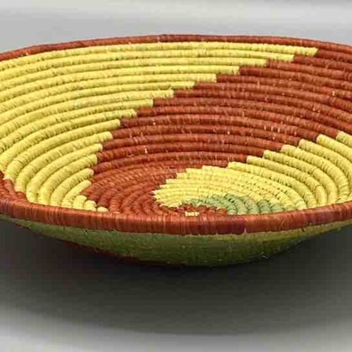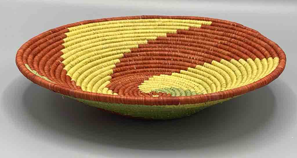 This basket/bowl is one of the thinnest coil and therefore finest quality woven basket in Africa. The design is among the most intricate, demonstrating the very advanced skill of the women of the Batoro tribe who make these in Uganda, near the Ruwenzori Mountains. This one is relatively small which affords the woman who made it to show off her exceptional basket weaving ability at a lower cost. We think these are the most beautiful and finest quality baskets we have ever seen, reflecting the unbelievable ingenuity of these amazing Ugandan artisans. Locally available natural dyes are used to create the vibrant colors which contribute to the beauty of these baskets This basket measures 8″ in diameter x 1 1/2″ deep (20 x 4 cm).