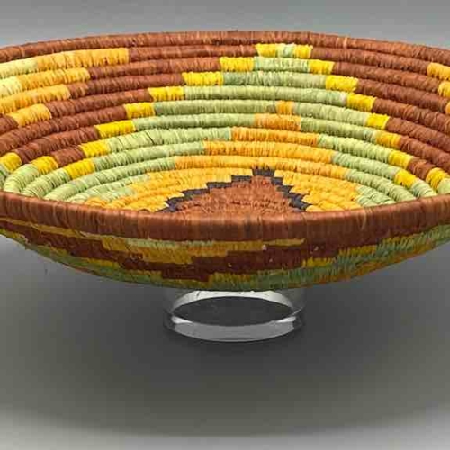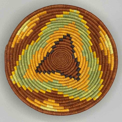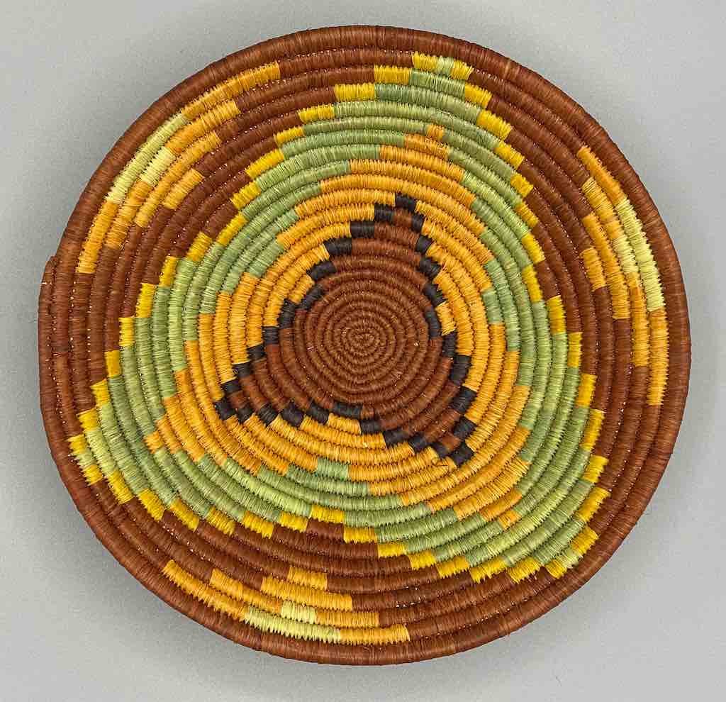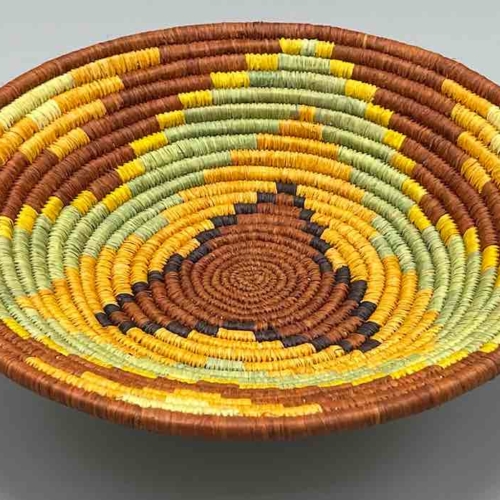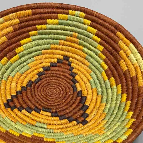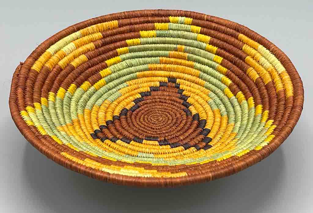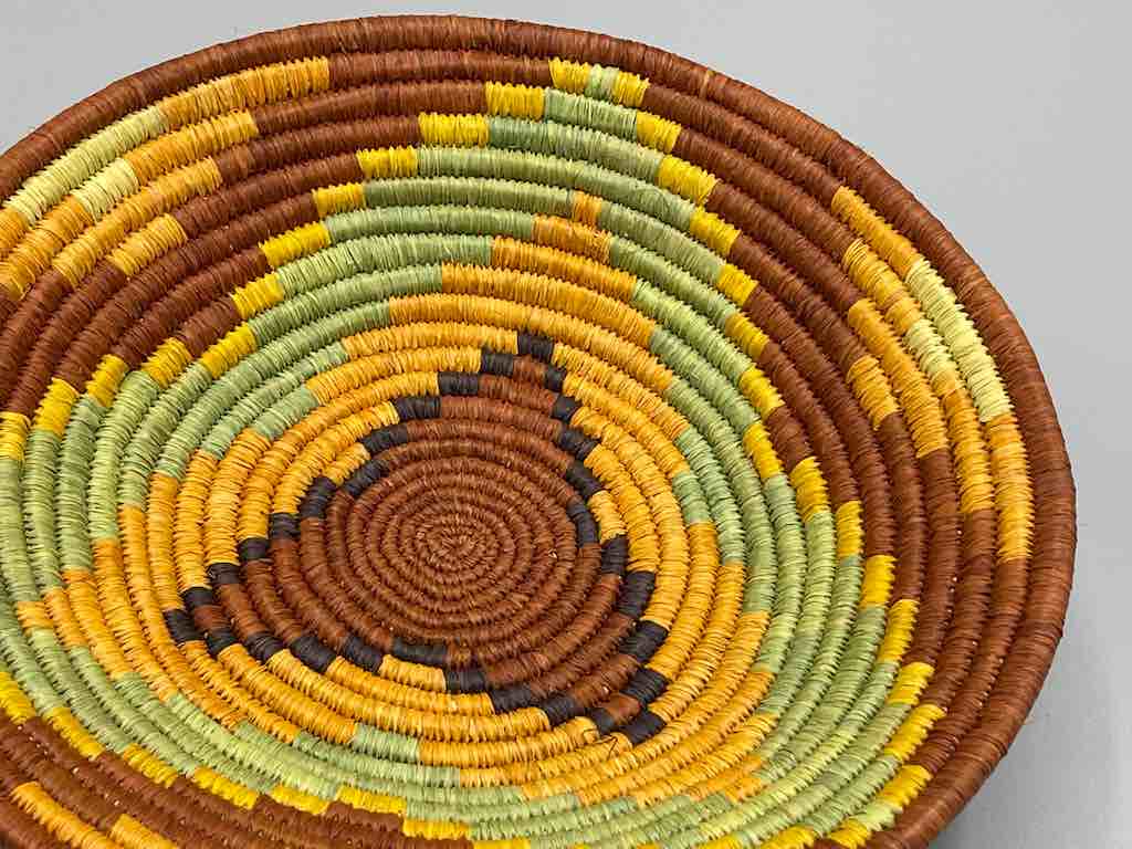 This basket/bowl is one of the thinnest coil and therefore finest quality woven basket in Africa. The design is among the most intricate, demonstrating the very advanced skill of the women of the Batoro tribe who make these in Uganda, near the Ruwenzori Mountains. This one is relatively small which affords the woman who made it to show off her exceptional basket weaving ability at a lower cost. We think these are the most beautiful and finest quality baskets we have ever seen, reflecting the unbelievable ingenuity of these amazing Ugandan artisans. Locally available natural dyes are used to create the vibrant colors which contribute to the beauty of these baskets This basket measures 7 7/8″ in diameter x 1 1/4″ deep (20 x 3 cm).