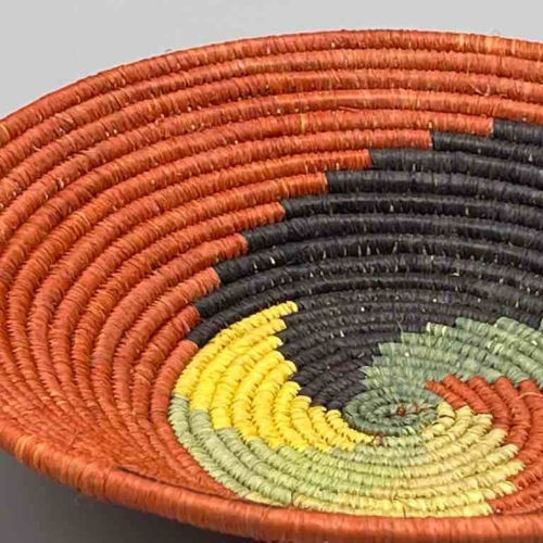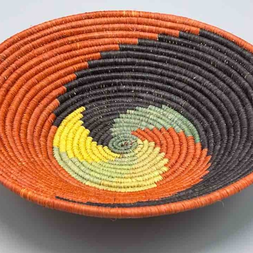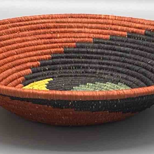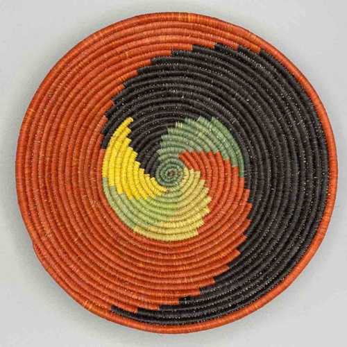 This basket/bowl is one of the thinnest coil and therefore finest quality woven basket in Africa. The design is among the most intricate, demonstrating the very advanced skill of the women of the Batoro tribe who make these in Uganda, near the Ruwenzori Mountains. This one is relatively small which affords the woman who made it to show off her exceptional basket weaving ability at a lower cost. We think these are the most beautiful and finest quality baskets we have ever seen, reflecting the unbelievable ingenuity of these amazing Ugandan artisans. Locally available natural dyes are used to create the vibrant colors which contribute to the beauty of these baskets This basket measures 7 7/8″ in diameter x 1 1/2″ deep (20 x 4 cm).
