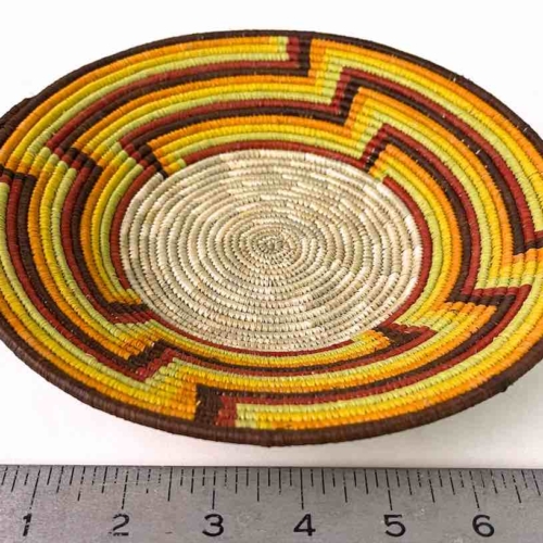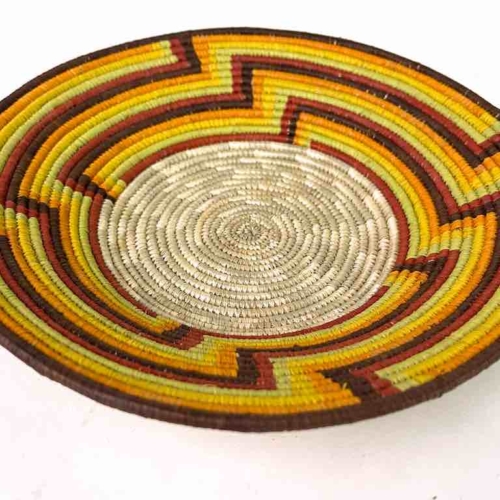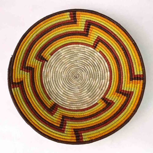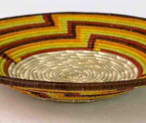 This basket/bowl is one of the thinnest coil and therefore finest quality woven basket in Africa. The design is among the most intricate, demonstrating the very advanced skill of the women of the Batoro tribe who make these in Uganda, near the Ruwenzori Mountains. This one is relatively small which affords the woman who made it to show off her exceptional basket weaving ability at a lower cost. We think these are the most beautiful and finest quality baskets we have ever seen, reflecting the unbelievable ingenuity of these amazing Ugandan artisans. Locally available natural dyes are used to create the vibrant colors which contribute to the beauty of these baskets This basket measures 8 1/4″ in diameter x 1 1/2″ deep.