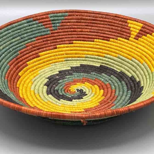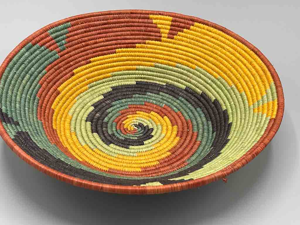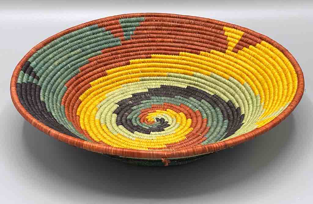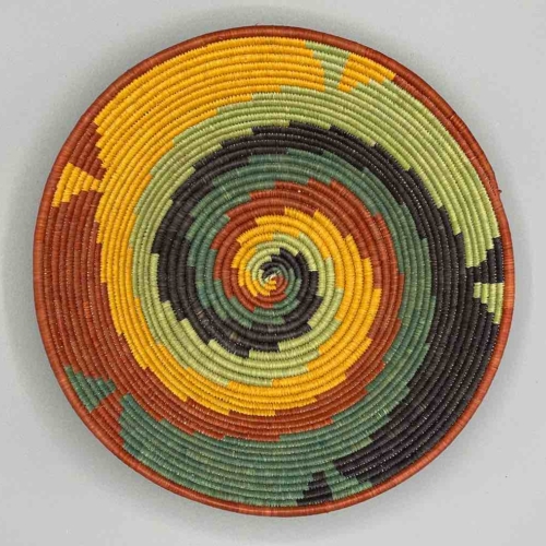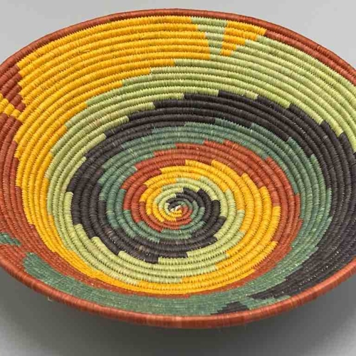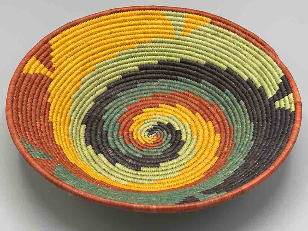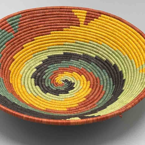 This basket/bowl is one of the thinnest coil and therefore finest quality woven basket in Africa. The design is among the most intricate, demonstrating the very advanced skill of the women of the Batoro tribe who make these in Uganda, near the Ruwenzori Mountains. This one is relatively small which affords the woman who made it to show off her exceptional basket weaving ability at a lower cost. We think these are the most beautiful and finest quality baskets we have ever seen, reflecting the unbelievable ingenuity of these amazing Ugandan artisans. Locally available natural dyes are used to create the vibrant colors which contribute to the beauty of these baskets This basket measures 8 1/2″ in diameter x 1 7/8″ deep (22 x 5 cm).