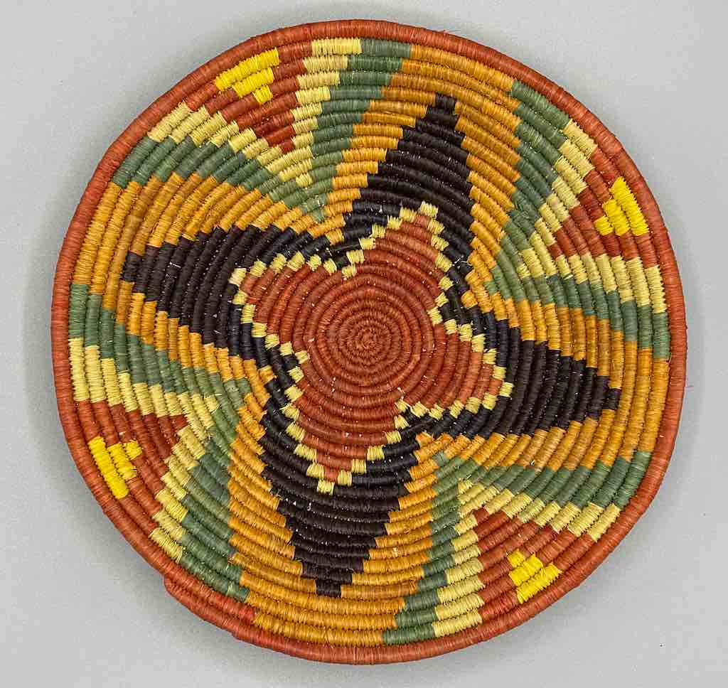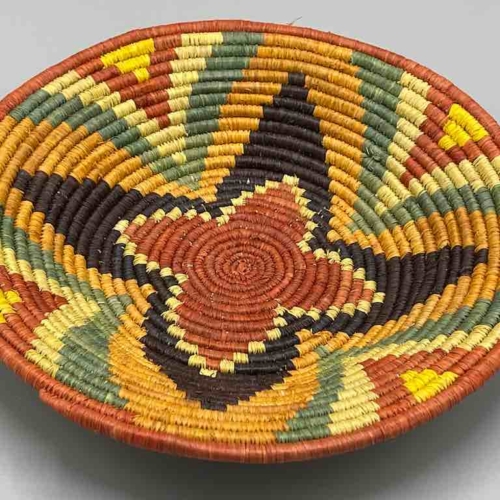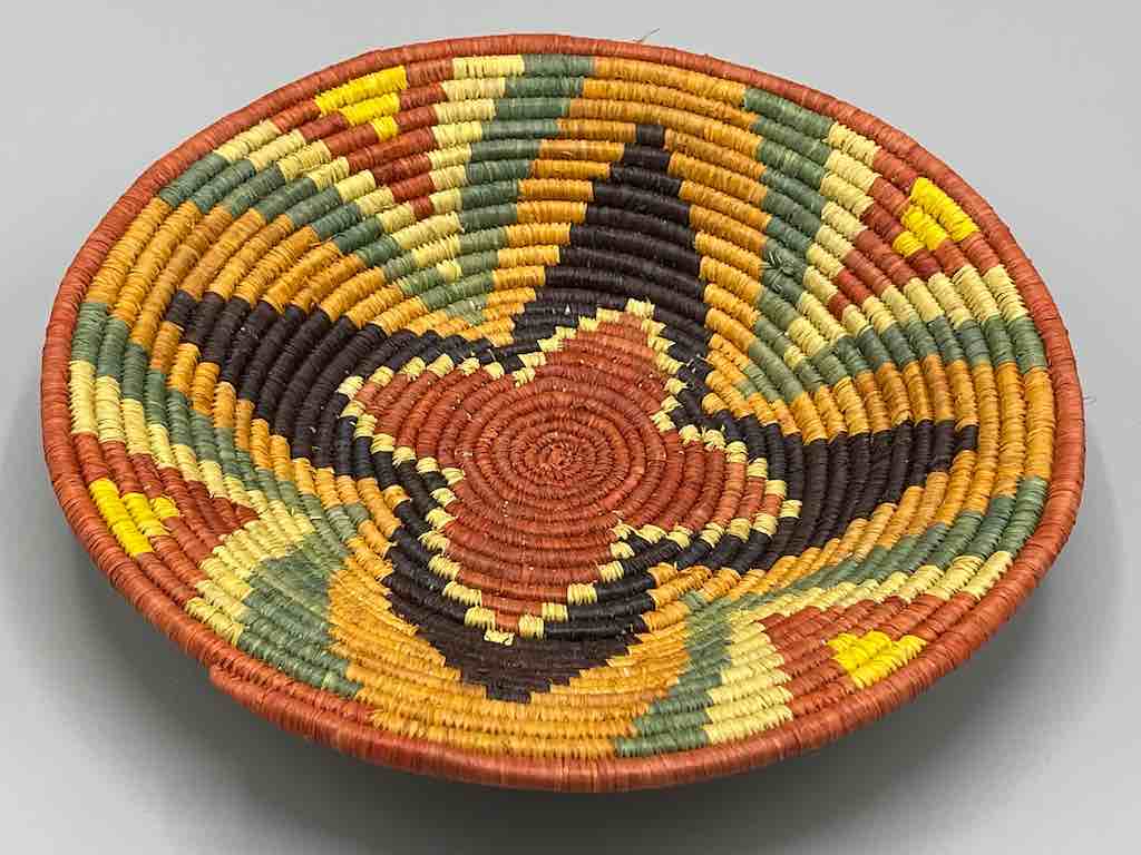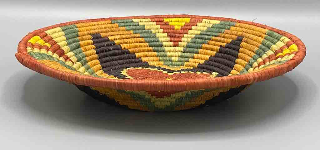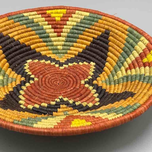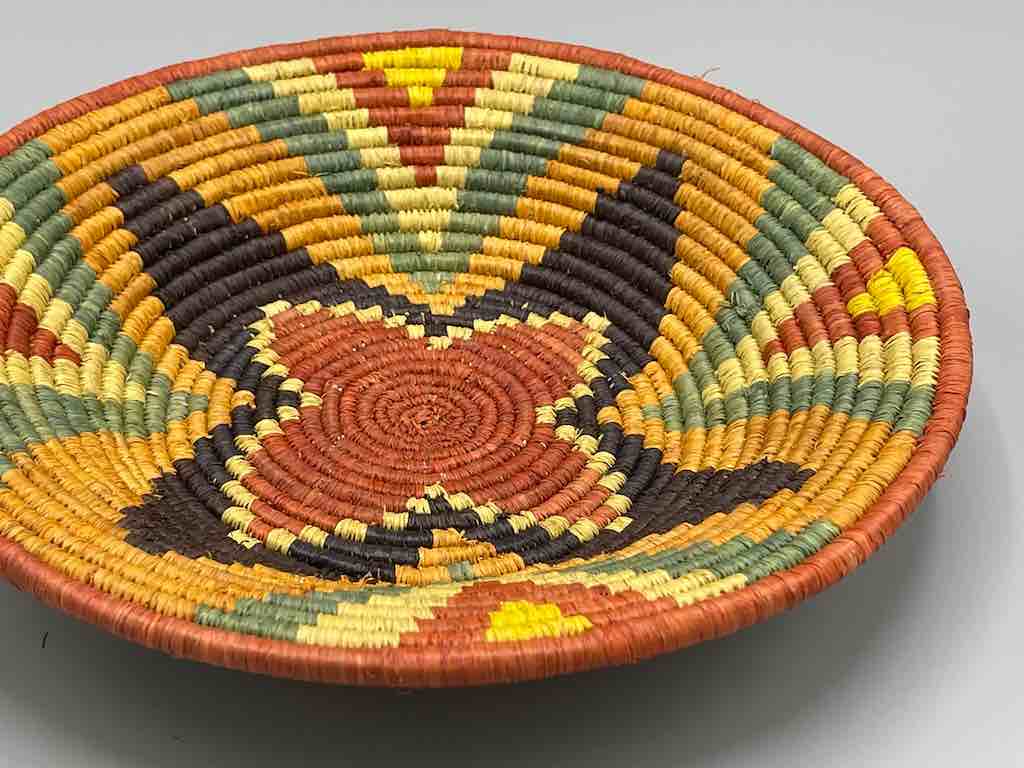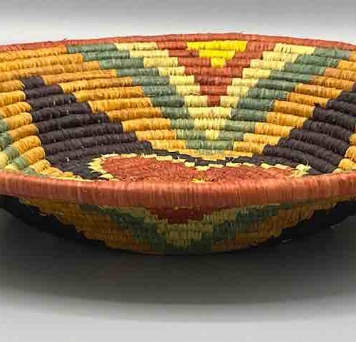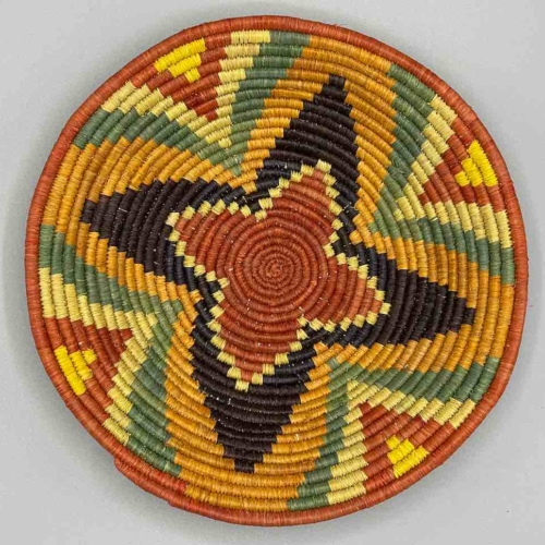 This basket/bowl is one of the thinnest coil and therefore finest quality woven basket in Africa. The design is among the most intricate, demonstrating the very advanced skill of the women of the Batoro tribe who make these in Uganda, near the Ruwenzori Mountains. This one is relatively small which affords the woman who made it to show off her exceptional basket weaving ability at a lower cost. We think these are the most beautiful and finest quality baskets we have ever seen, reflecting the unbelievable ingenuity of these amazing Ugandan artisans. Locally available natural dyes are used to create the vibrant colors which contribute to the beauty of these baskets This basket measures 8 3/8″ in diameter x 1 1/2″ deep (21 x 4 cm).