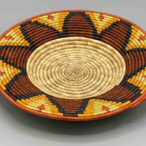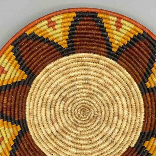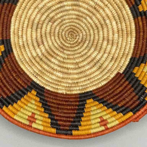 This basket/bowl is one of the thinnest coil and therefore finest quality woven basket in Africa. The design is among the most intricate, demonstrating the very advanced skill of the women of the Batoro tribe who make these in Uganda, near the Ruwenzori Mountains. This one is relatively small which affords the woman who made it to show off her exceptional basket weaving ability at a lower cost. We think these are the most beautiful and finest quality baskets we have ever seen, reflecting the unbelievable ingenuity of these amazing Ugandan artisans. Locally available natural dyes are used to create the vibrant colors which contribute to the beauty of these baskets This basket measures 8 3/4″ in diameter x 1 1/4″ deep (22 x 3 cm)