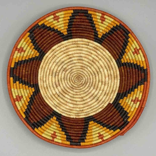 This basket/bowl is one of the thinnest coil and therefore finest quality woven basket in Africa. The design is among the most intricate, demonstrating the very advanced skill of the women of the Batoro tribe who make these in Uganda, near the Ruwenzori Mountains. This one is relatively small which affords the woman who made it to show off her exceptional basket weaving ability at a lower cost. We think these are the most beautiful and finest quality baskets we have ever seen, reflecting the unbelievable ingenuity of these amazing Ugandan artisans. Locally available natural dyes are used to create the vibrant colors which contribute to the beauty of these baskets This basket measures 8 3/4″ in diameter x 1 1/4″ deep (22 x 3 cm)
