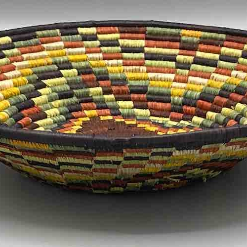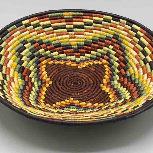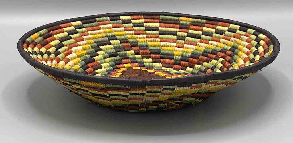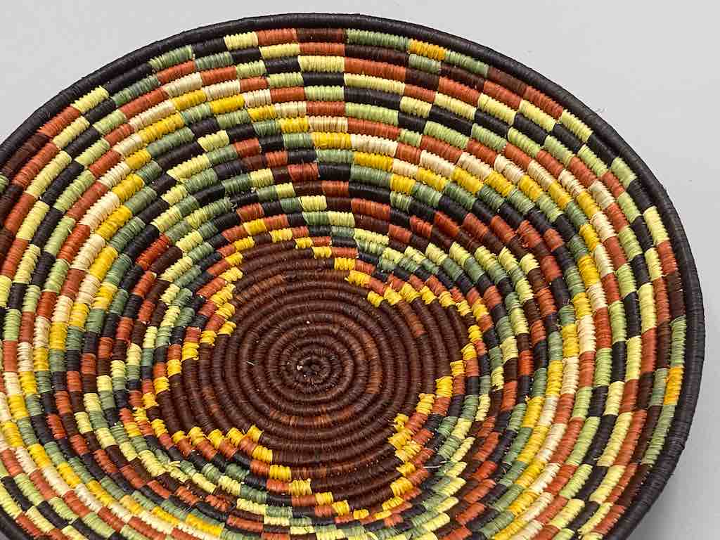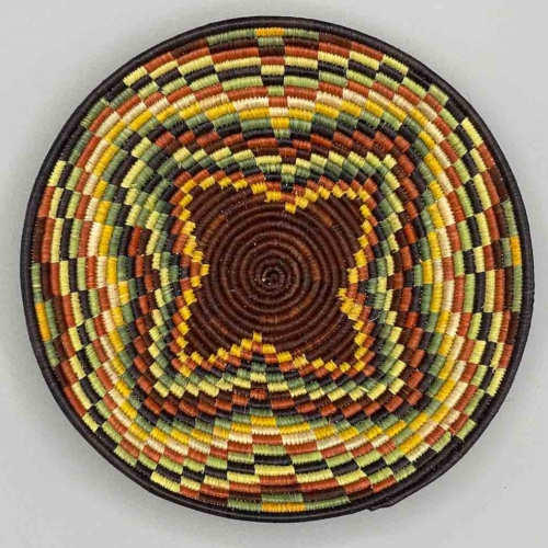 This basket/bowl is one of the thinnest coil and therefore finest quality woven basket in Africa. The design is among the most intricate, demonstrating the very advanced skill of the women of the Batoro tribe who make these in Uganda, near the Ruwenzori Mountains. This one is relatively small which affords the woman who made it to show off her exceptional basket weaving ability at a lower cost. We think these are the most beautiful and finest quality baskets we have ever seen, reflecting the unbelievable ingenuity of these amazing Ugandan artisans. Locally available natural dyes are used to create the vibrant colors which contribute to the beauty of these baskets This basket measures 8 3/4″ in diameter x 1 5/8″ deep (22 x 4 cm).