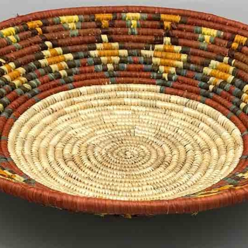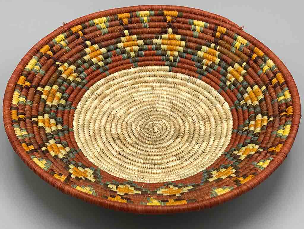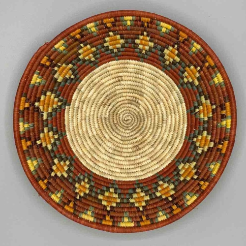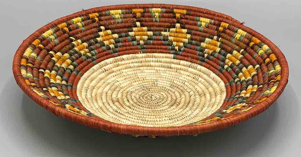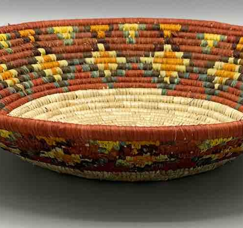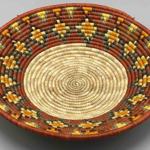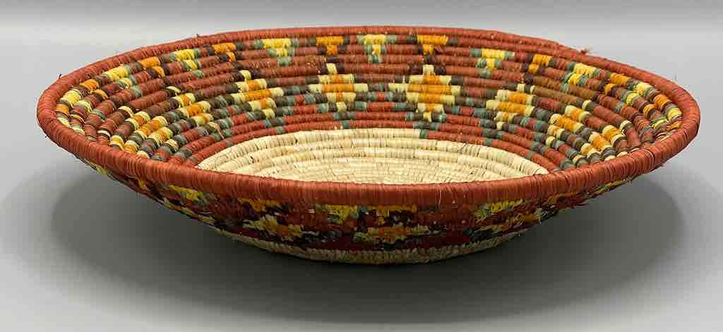 This basket/bowl is one of the thinnest coil and therefore finest quality woven basket in Africa. The design is among the most intricate, demonstrating the very advanced skill of the women of the Batoro tribe who make these in Uganda, near the Ruwenzori Mountains. This one is relatively small which affords the woman who made it to show off her exceptional basket weaving ability at a lower cost. We think these are the most beautiful and finest quality baskets we have ever seen, reflecting the unbelievable ingenuity of these amazing Ugandan artisans. Locally available natural dyes are used to create the vibrant colors which contribute to the beauty of these baskets This basket measures 9″ in diameter x 1 1/2″ deep (23 x 4 cm)