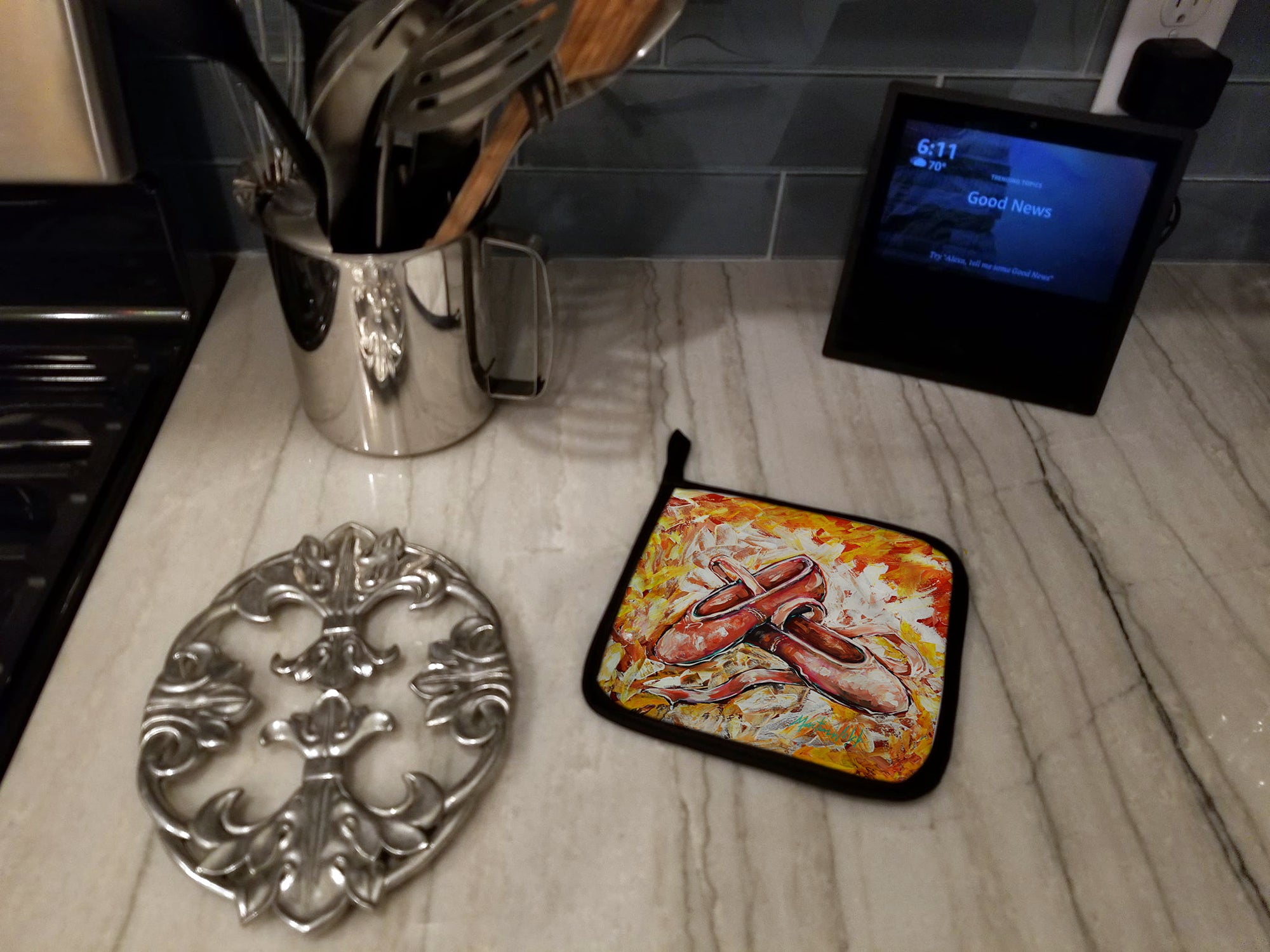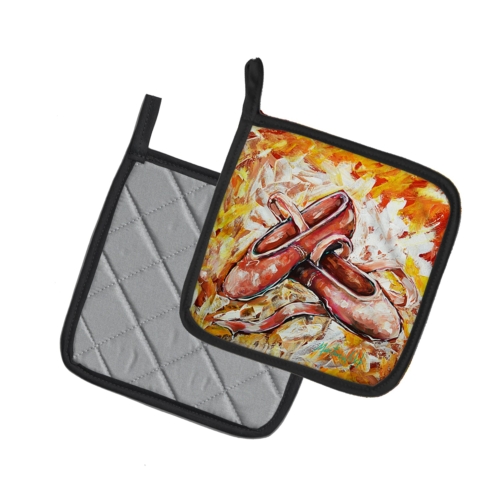 A Pair of Pot Holders to match your kitchen decor. Made in the USA these are thick and functional. Full color artwork decorates the front polyester fabric of the hot pad and accented by a black trim. Use these at as a trivet for your Thanksgiving or Christmas tablescape. Filled with insulated fabric and quilted for durability. These colorful pot holders will make a great gift for your favorite home cook or executive chef. Each pot holder measures approximately 7 1/2 inches by 7 1/2 inches. A hanging tab is included.