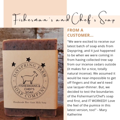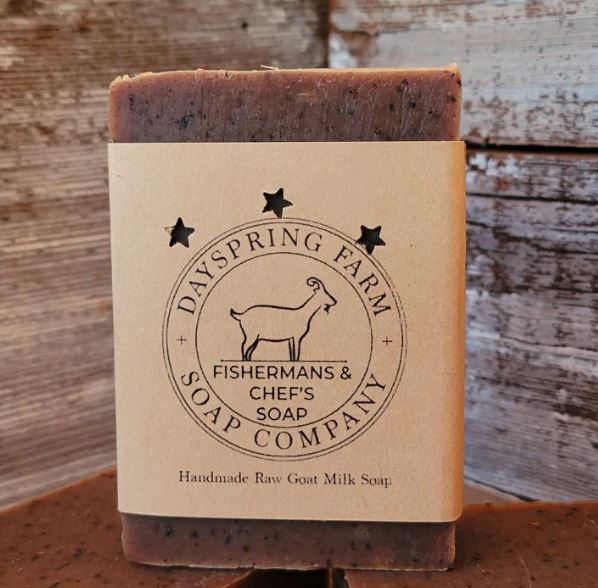 Do you love to cook but don’t love your hands smelling like you just roasted an entire bed of garlic? Do you love to fish but prefer your hands don’t smell like the inside of your catch? Maybe you’re a mechanic wishing your hands didn’t smell like used motor oil. We are here for you! You wash your hands a ton, so you need soap that doesn’t strip your natural oils away and something that maintains your skin’s protective barrier – look no further than goat milk soap. You also want those odors out, and the blend of orange and cinnamon leaf essential oils combined with just enough coffee grounds to be pleasantly exfoliating (not scratchy!) will make your hands feel and smell great. Introducing Chef’s (and fisherman’s and mechanic’s and gardener’s, but we couldn’t cram that all into the label) Soap. We named it “Mocha Valencia” after one of Annie’s favorite drinks – coffee, cocoa, milk and orange. This soap feels as delicious as it smells. Real coffee in the soap neutralizes odors and can even relax you and improve your mood. Raw goat milk gently cleanses and moisturizes, and has been shown to have antimicrobial and antibacterial properties (can your hands be too clean when you’re the cook?). Orange and cinnamon leaf essential oils further deodorize and leave your skin smelling fresh and clean. As always, free of weird ingredients, petroleum distillates, sulfates and parabens. Ingredients: saponified tallow, lard, olive oil, coconut oil, castor oil, fresh raw goat milk, brewed coffee, orange and cinnamon leaf essential oils, coffee grounds, cocoa powder. See notes about our soap ingredients here. Please note this is a handmade item – color and shape may vary, but we are meticulous about product weight accuracy. We find our soaps last a good long while (despite being put to hard testing by a family of 7!), but all bar soaps will last longer if allowed to drain well or even dry out between uses. As always, this and many more products are available directly from Dayspring Farm Soap Company