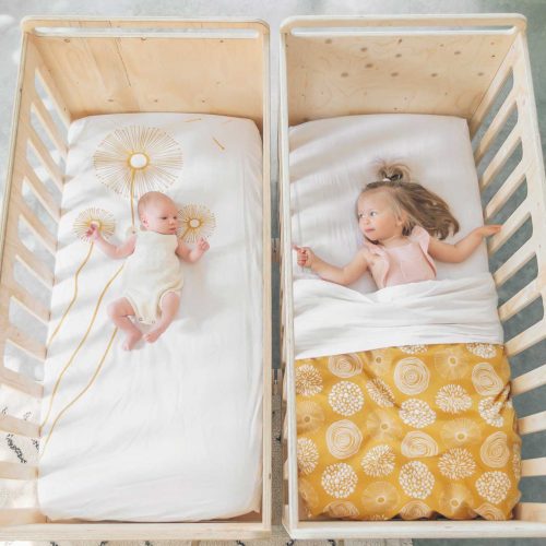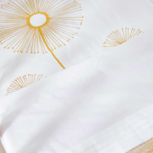 The fitted sheet ‘Blow a sparkle in the sky’ is offwhite with a unique large drawing of 3 dandelions in ochre.