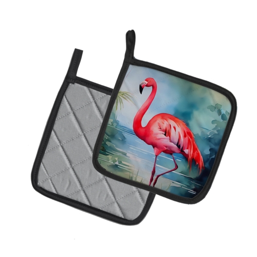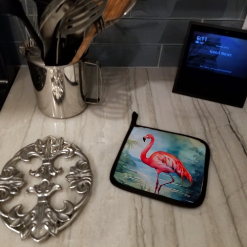 Pair of Pot Holders featuring breed specific Flamingo artwork. A Pair of Pot Holders to match your kitchen decor. Made in the USA these are thick and functional. Full color artwork decorates the front polyester fabric of the hot pad and accented by a black trim. Use these at as a trivet for your Thanksgiving or Christmas tablescape. Filled with insulated fabric and quilted for durability. These colorful pot holders will make a great gift for your favorite home cook or executive chef. Each pot holder measures approximately 7 1/2 inches by 7 1/2 inches. A hanging tab is included.