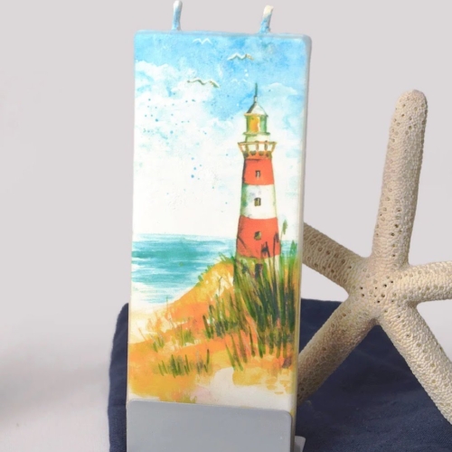 Classically striped in red and white with a lookout railing at the top, this lighthouse makes a beautiful addition to any coastal decor. Sandy beach, scattered reeds, and shore birds provide the finishing nautical touch, with calming waves in the background. Hand-painted in Lithuania, these candles stand out in their simplicity. The flatter design is a unique approach to candles that have a minimal and eye-catching feel. The twin wicks burn evenly and self-extinguish as they near the steel base, without any dripping wax or smoke. -Handmade using the highest quality German raw materials-Twin wicks ensure candle burns evenly and self-extinguishes as it nears the base-Steel stand helps make candle attractive display piece and doubles as a snuffer-Non-dripping, evaporates as it burns-Unscented and smoke-free-Every candle is hand painted-Creative gift and great stocking stuffer-Fits perfectly inside a greeting card Burning time: 3-4 hoursMade in LithuaniaMaterials: Highly Refined Paraffin wax, Steel, Organic Cotton WickIncludes: One handmade flat candle and steel standDimensions: 2.4″” x 0.4″” x 5.9″”Weight: 0.22 lb”