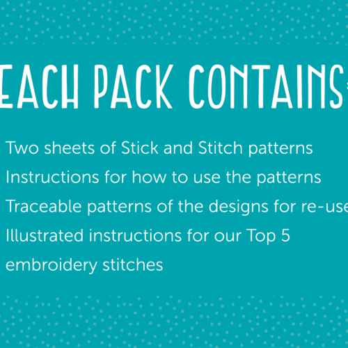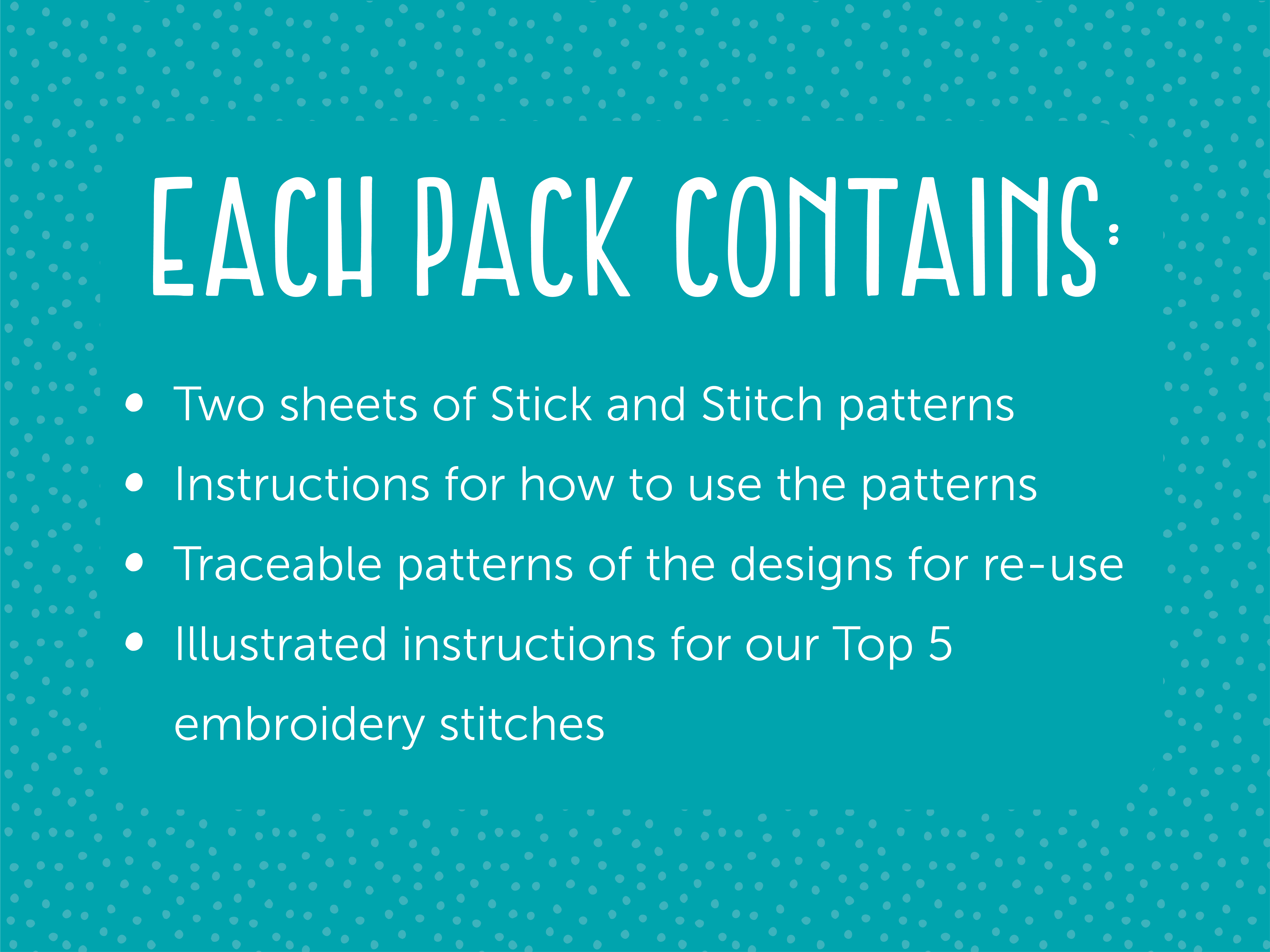 Stick and Stitch Embroidery Patterns are great for up-cycling, adding to garments, bags… you name it! If you can sew it, you can stick and stitch it.