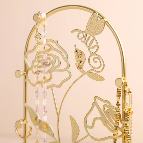 The arched frame features a delicate floral design, with notches made specifically for hanging chains and bracelets. Throughout the design are slots to store earrings and studs. At the base of the metal stand is a sweet pink Terrazzo plate.This jewellery stand comes with a hex key and two bolts, allowing you to attach and tighten the frame to the base. Dimensionslength 25cm x width 25cm x depth 14.5cmMade fromterrazzo, metal
