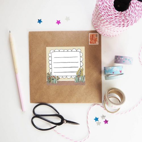 Every card comes with a kraft brown envelope which has an illustrated address sticker attached and are individually wrapped in a biodegradable cellophane bag.