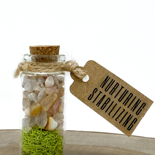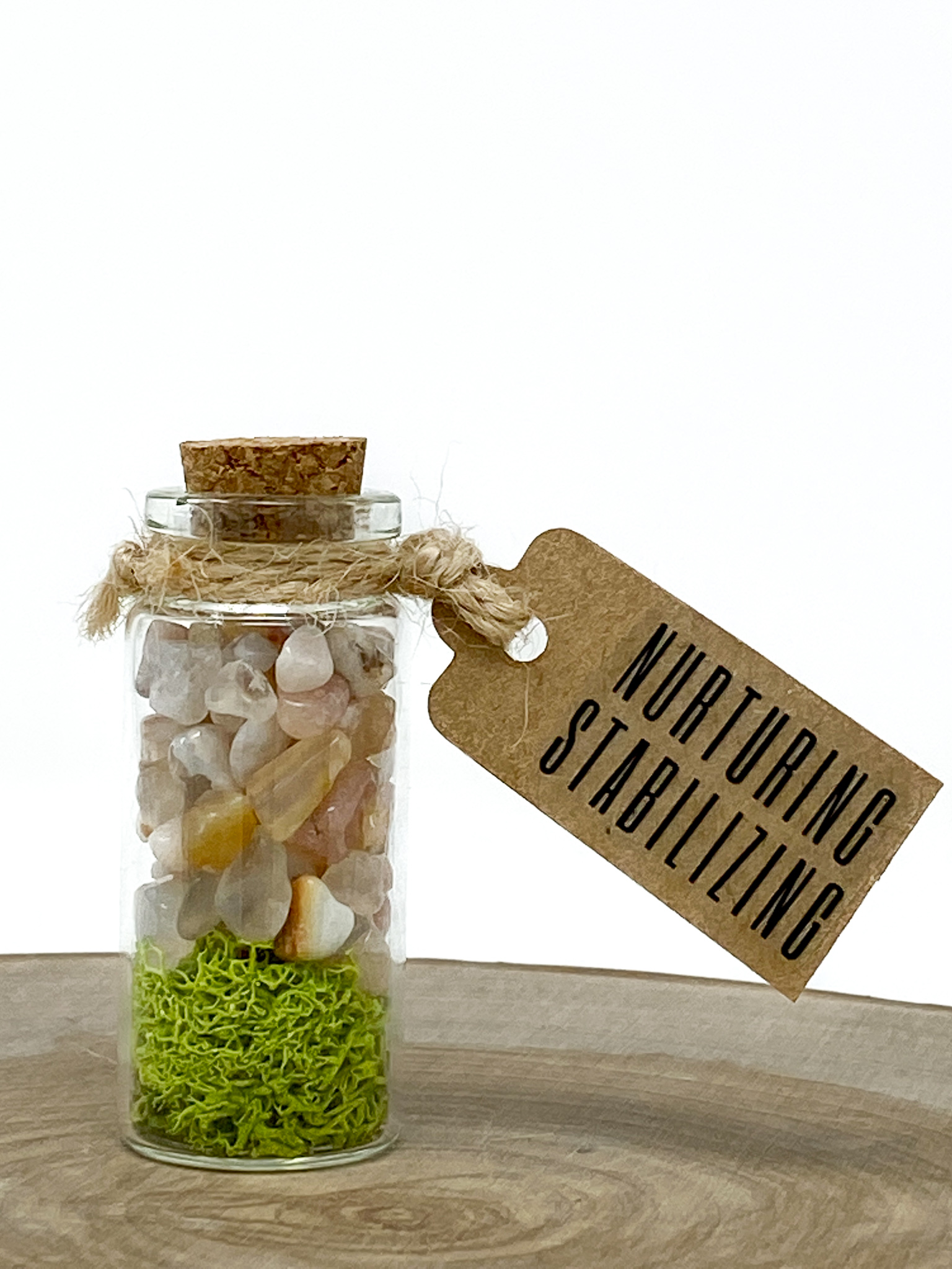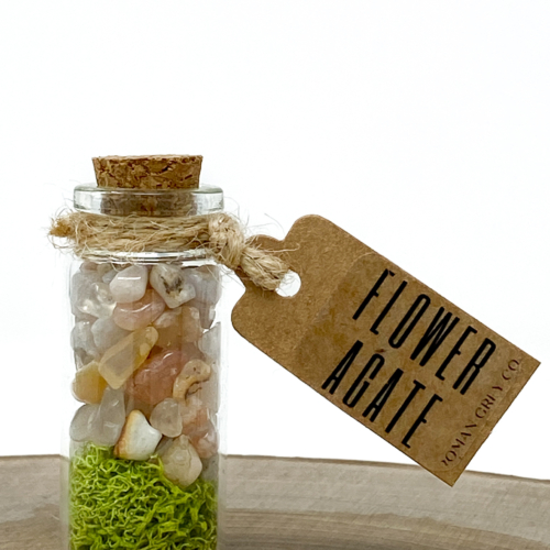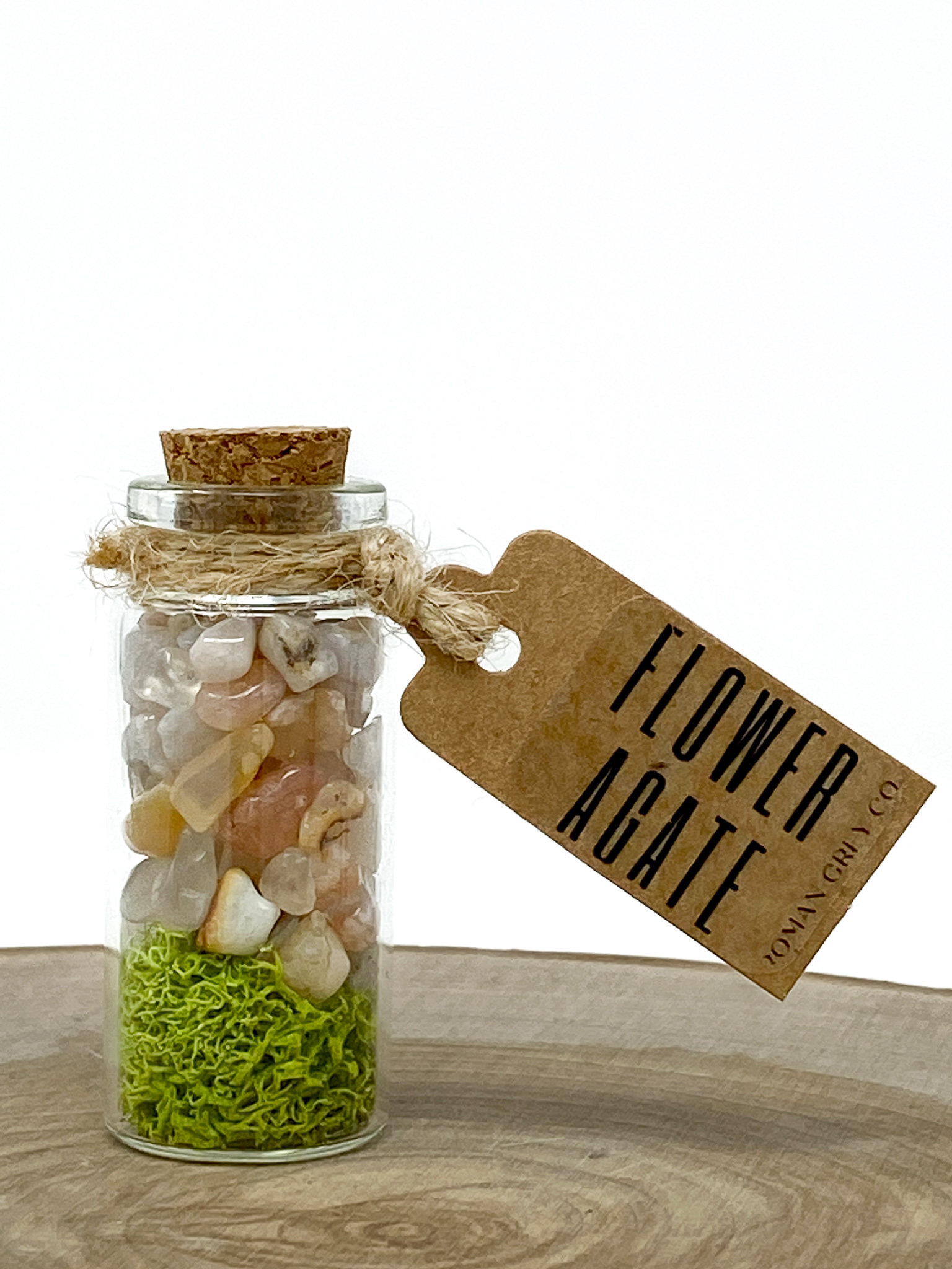 Flower Agate crystals rest on a bed of reindeer moss in a glass vile with a cork closure.