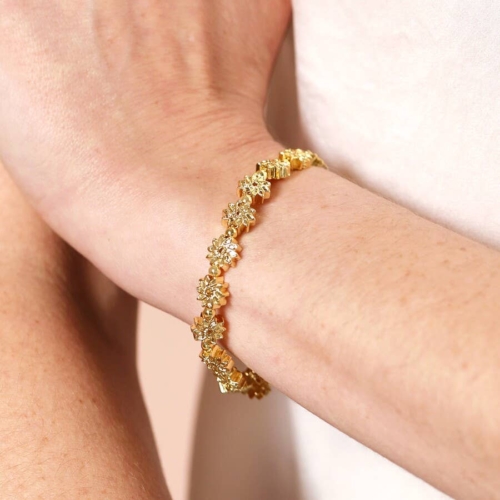 A spring-themed gold plated braceletFeaturing repeating flower beadingMade of comfortable jewellery elasticPerfect for spring-summer themed jewellery collectionsDimensions: inner circumference 17.1cmMade from: 14ct gold plated brass