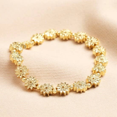A spring-themed gold plated braceletFeaturing repeating flower beadingMade of comfortable jewellery elasticPerfect for spring-summer themed jewellery collectionsDimensions: inner circumference 17.1cmMade from: 14ct gold plated brass