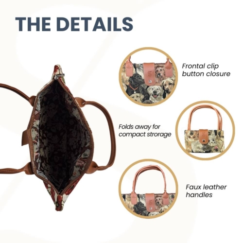 FABRIC COMPOSITION: 100% Polyester.EASY CARE: Clean it with a damp cloth. Do not soak in water.Enjoy your day with pretty shopping bags by Signare.[custom_html] PRODUCT DESCRIPTION: Compact and eco-friendly, portable shopping bag. This tapestry collapsible grocery bag piece opens up to provide ample space for your shopping trips and folds away for easy storage in your handbag Fitted with full length zip fastener and a frontal clip button closure Opens up to provide ample room for shopping goods Folds away for compact storage A pair of sturdy faux leather handles for carrying, handle drop approx. 6″ Size approx. W12″ x H 13.9″ x D 3.5″ inches – Weight: 0.6 lb [/custom_html]