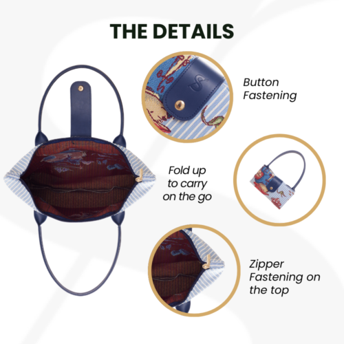 Compact and eco-friendly portable shopping purse. This tapestry collapsible grocery clutch bag piece opens up to provide ample space for your shopping trips and folds away for easy storage in your handbag.