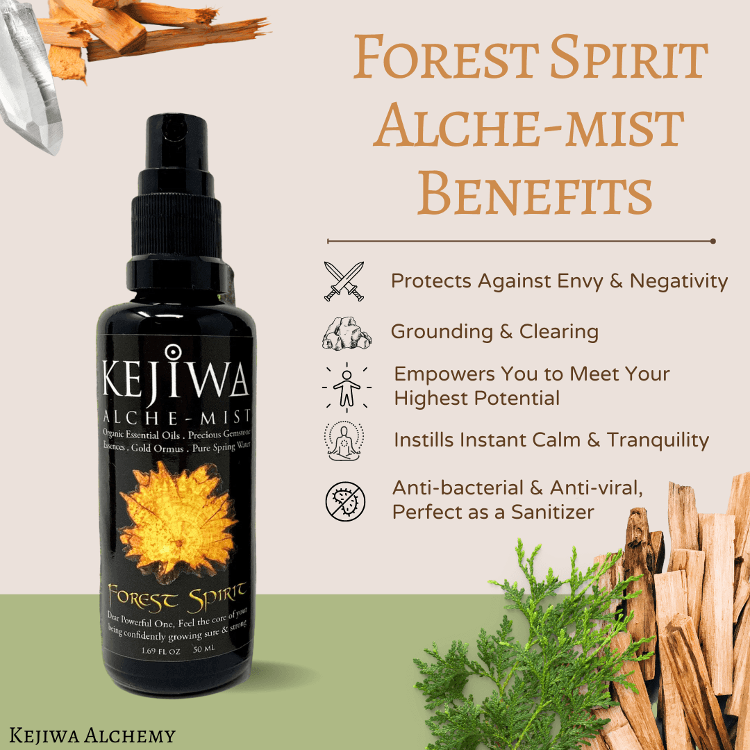Forest Spirit Alche-Mist An empowering Palo Santo and Sandalwood Aromatherapy Mist to instantly transport you to a heavenly experience of Grounded Clarity. A lovely sweet woody and exhilarating scent that transports the freshness of the forest to anywhere it is sprayed. Made with Palo Santo, Sandalwood, and Cedar essential oils; Forest Spirit Alche-Mist is powerfully purifying, calming, and activating to help you maintain balance and inner peace. Palo Santo, meaning “Holy Tree,” is the sacred smudge and clearing herb of South American wisdom keepers. This enticing spiritual oil aids the third-eye (pineal gland) in its role of balancing all of your chakras; bringing you an experience of ease, clarity and strength. HIGH-VIBE PROTECTION – Wards off pesky spirits, clearing your aura and calling in the Light for protection and amplification of your energetic field, providing an instant mood uplifting, calming, and grounding energy. NATURAL RELIEF – Palo Santo essential oil contains high levels of limonene; a bio-active terpene with anti-inflammatory, antioxidant, and anti-cancer properties known to improve headaches, relieve allergies, reduce cold/flu symptoms, and more. INSTANT TRANQUILITY AND CALM – With the added protecting and rejuvenating support of Sandalwood and Cedar, this mist is wonderfully clearing, relaxing, and activating to the Third Eye to enhance spiritual awareness. This combination naturally helps with insomnia, anxiety, stress, emotional stability, and more. GEMSTONE INFUSED – Hand crafted, Lightning-struck Lemurian Seed Quartz essence, which holds volumes of ancient wisdom, a bridge between heaven and earth – a perfect metaphor for you! If you’re looking for something natural and high vibe for protecting your hands, body, aura, and home space, we recommend our Forest Spirit Alche-Mist aromatherapy spray. ~Dear Powerful One, Feel the core of your being confidently growing sure & strong~ ~ How to experience Forest Spirit: Palo Santo and Sandalwood are considered sacred woods commonly burned as a smudging tool to purify your energy while also calling in the Light. Introduce this Alche-Mist into your daily meditation ritual to support your third-eye chakra in deepening intuitive insight and purify the energy in your space. Mist around your head and face for instant calming of the nervous system to reduce feelings of anxiety while benefiting from the grounding force of sacred woods to support mental clarity and emotional balance. Spray on hands and surfaces for a pleasantly natural antibacterial disinfectant that can be carried in your purse or car for convenience.