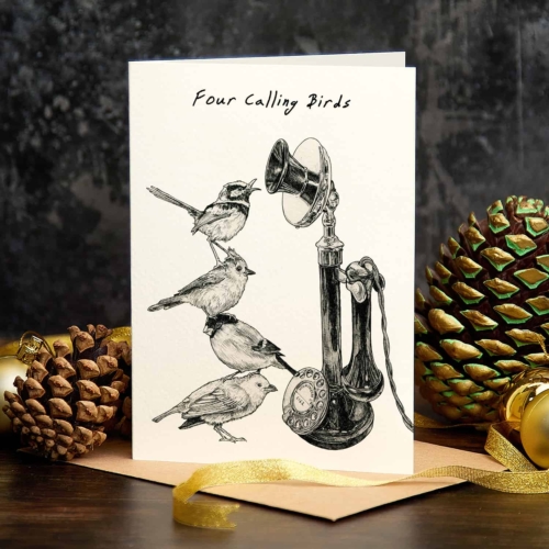 Inspired by the “Twelve Days of Christmas” song, we give you the Four Calling Birds card! Blank inside, and the perfect Christmas card, which makes people smile.