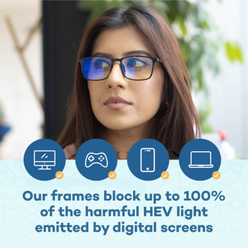 The Harrison Everyday lenses (black frame) block 30%-50% of all HEV blue-light between 430-450nm spectrum and 100% from 400nm, offering ample protection whilst minimising colour distortion.