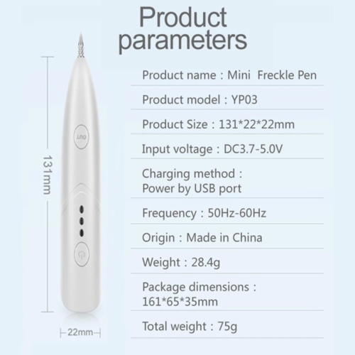 Easy & Safe: Pen can easily do beauty at home, Mole, Tattoo, Freckle Removal Machine Family Salon Mini Portable Skin Care Laser Plasma Pen. Operations: Three Modes, operates with electron ion technology, mini & compact design, easy to charge. Modes:3 modes of different operations, higher level is used on mole, skin tag & tattoo, Lower level is used on Spot & freckle. Electro-Ion Carbonization: Accurate control of current, carbonize at the moment of contact to quickly remove surface pigment & lining pigments.*******************Features:*******************Model Number:BH0054Feature: Pore RemoverMaterial: ABSWaterproof: YesTarget Area: FaceWarranty:1 YearColor: WhiteFrequence:50Hz-60HzProduct Size:13.1*2.2*2.2cmWeight:75gPackage Dimensions:16.1*6.5*3.5cm