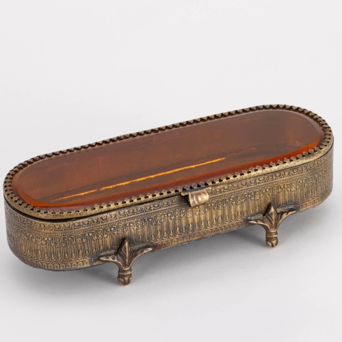 Elegant and timeless, this Victorian-style spectacle box features a delicate filigree metal design paired with Amber glass panels, blending vintage charm with modern sophistication. Perfect for storing spectacles, sunglasses, or even keepsakes, its ornate detailing and transparent finish make it as decorative as it is functional. A beautiful addition to any vanity, dresser, or desk, this piece offers a graceful way to protect and display your essentials.