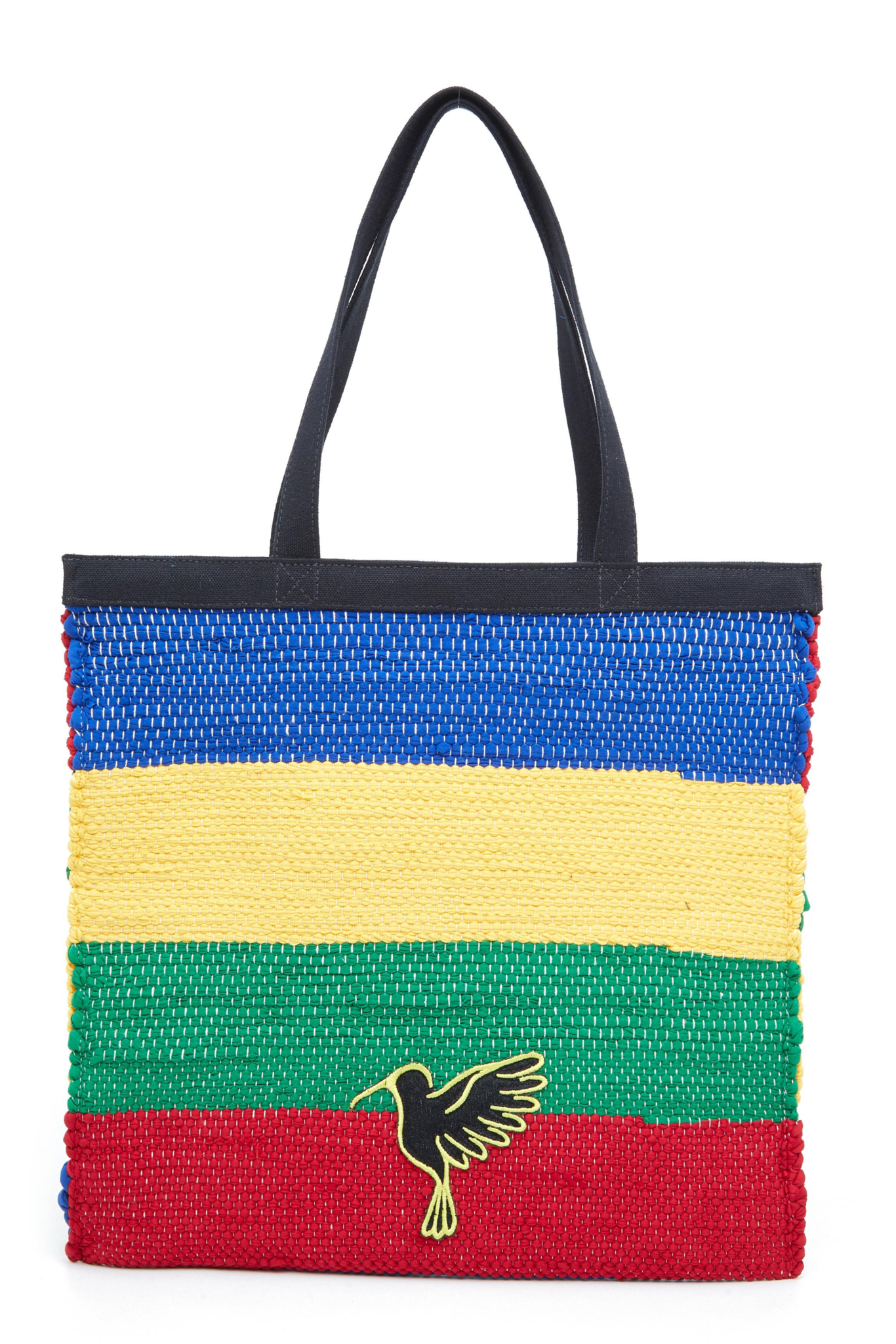 The multicoloured woven shopper bag consists of a large inside pocket with magnetic snap for loose items and an attached ring to hold your keys.
