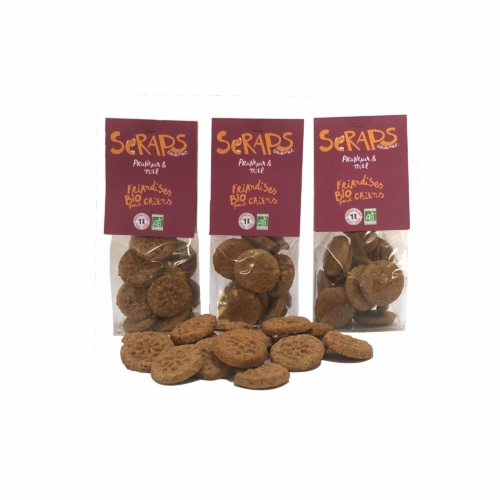 Plutôt que de lui offrir un sucre, préférez ces savoureux biscuits à base de la farine de blé, de pain recyclé, de pruneaux et de miel relevé d’épices (une pointe de cannelle, d’anis vert, de gingembre, de muscade et de girofle) et de sel. Sans additif, ni conservateur. La récompense ultime !