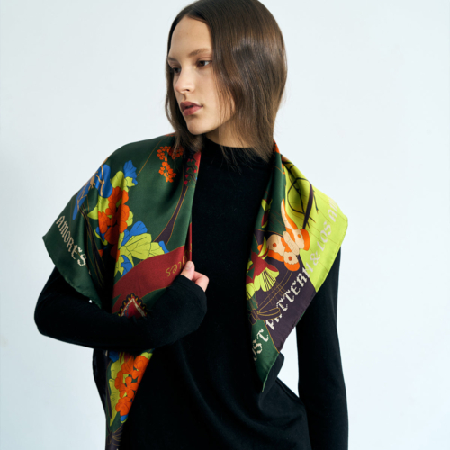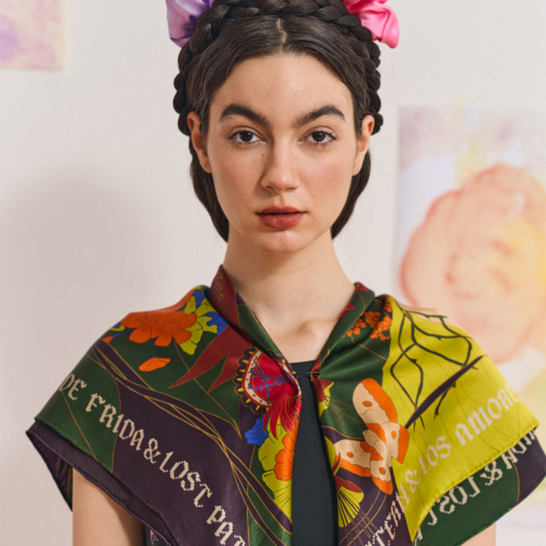 Introducing the”Los Amores de Frida” Large Silk Scarf and ourFRIDA X LOST PATTERN collection, acollaboration between LOST PATTERN and the FRIDA KAHLO familia thatpays homage to the iconic self-portrait of Frida Kahlo.Crafted from luxurious silk satin, this scarf is not only a beautiful accessory, but also a work of art. The intricate design features a vibrant color palette and intricate details that bring Frida’s self-portrait to life.Measuring 85cm x 85cm ( 33″W x 33″L inches), this scarf is large enough to be worn in a variety of styles, from draped over the shoulders to wrapped around the neck. It’s the perfect statement piece to add a touch of elegance and sophistication to any outfit. Product Description: 100% mulberry silk 85cm x 85cm ( 33″W x 33″L ) Hand-rolled edges with hand stitched finishing Double sided printing technique 3 color options: Dark Green, Pastel, Pink & Purple *Due to the handmade nature of the edges, the measurement may vary slightly. How to Wear a Silk Square Scarf: As a hair accessory: tied around your pony, giving an elegant and bohemian look. As a scarf: wear it around the neck, you can tie a bow or let the end hang loose. Goes well with a plain tube top or tank top to make the pattern stand out. As a top: wrap around your body to make a beautiful silk tube top, tie it in the front or at the back. As a shawl: loosely worn over the shoulders, upper body, and arms, and even overhead. Style it any way you want in your own mood and creativity! ABOUTFRIDA x LOST PATTERN We are excited and honored to announce that we are partnering with the Familia Kahlo to launch this collaboration inspired on the great artist Frida Kahlo. Frida is not only a great artist who inspires us – she is an icon whose legacy transcends her time. She carried great inner strength, she was true to her convictions, and her courage in the face of adversity touches us still today. Her avant-garde style of fashion coupled with her love of Mexico and its culture give us great inspirations and influences. Lost Pattern was created with a vision to document our fading memories in unique colors & patterns. We are so honored to uncover the untold emotions of Frida, in her Lost Pattern stories. Mara Kahlo, Frida Kahlo’s grandniece said: “At Familia Kahlo we are very excited to start this venture together with Lost Pattern, for us it’s an honor to see that our beloved Frida has fans all over the world. We are sure this would be a very successful partnership.”