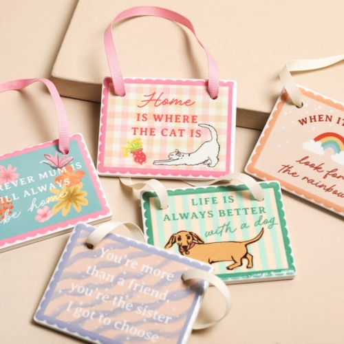 A purple scalloped-edge hanging decorationWith a wavy purple and pink backgroundFeaturing a meaningful friendship quotePerfect for colourful homeware collectionsDimensions: width 8cm x height 6cm x depth 0.5cmtotal hanging height 10cmMade from: ceramic, ribbon