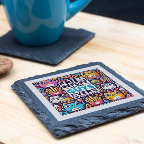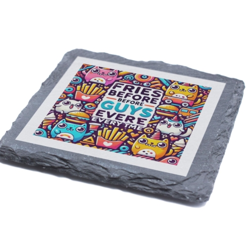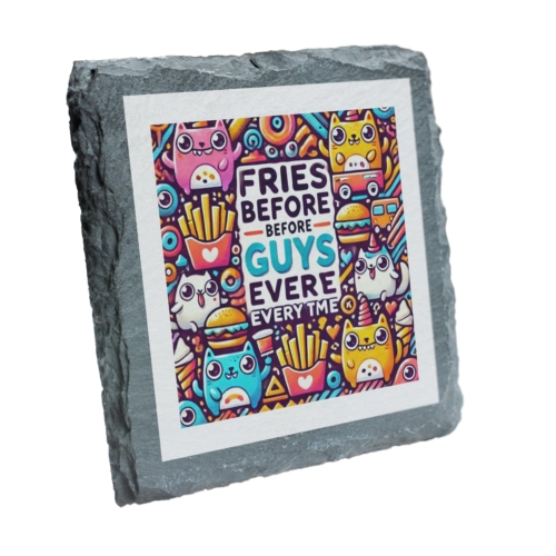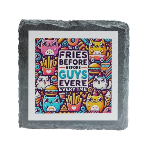 Celebrate your love for fries and fun with the “Fries Before Guys” slate coaster. This vibrant design combines adorable illustrations with a humorous phrase, making it the perfect addition to your kitchen, dining area, or living room. Crafted from high-quality slate, this coaster not only protects your surfaces but also brings a touch of whimsy to your home. It?s a great gift for food enthusiasts, humor lovers, or anyone who appreciates unique decor. Add a playful vibe to your space with this charming slate coaster! Whimsical Design: Bright and playful illustration featuring adorable characters and the hilarious quote “Fries Before Guys.” Premium Slate Material: Made from durable and natural slate for a stylish yet functional design. Perfect Gift Idea: A quirky present for friends, family, or anyone who loves fries and humor. Protective and Practical: Safeguards surfaces from heat and moisture while adding a fun touch to your decor. Easy Maintenance: Simply wipe clean with a damp cloth to keep it looking great.
