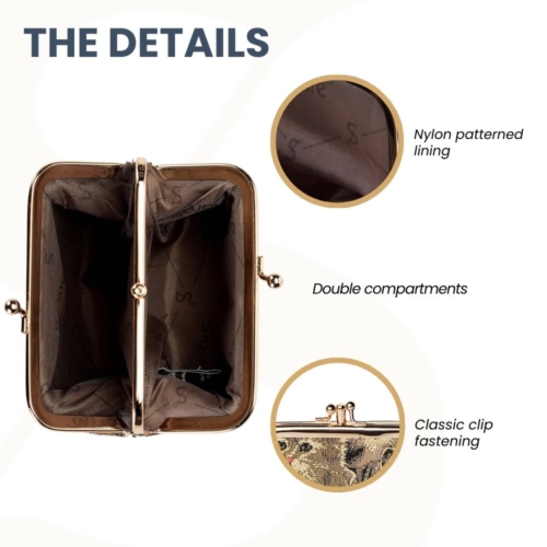 Contains a gold or silver frame (depending on design) with double clasp closure.