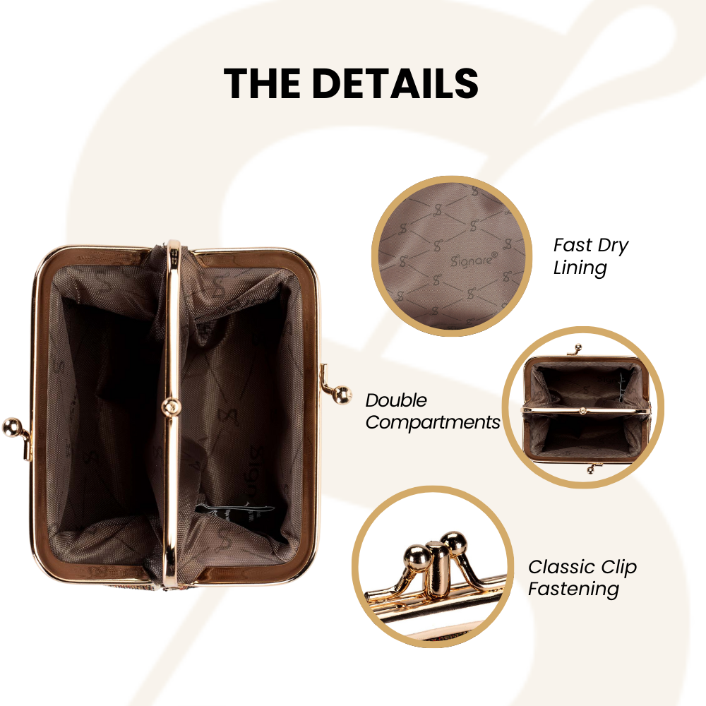 Contains a gold or silver frame (depending on design) with double clasp closure.
