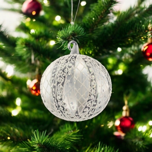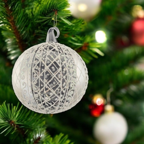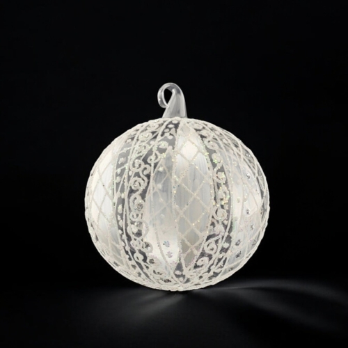 Old world craftsmanship comes to life in these elegant, hand-made ornaments. Blown glass ornaments are a traditional staple world-wide so not only would they look great on your tree, they also make for great gifts!!!Each of our blown glass pieces is hand painted with skill, precision and love. You will notice a clear and frosted finish accented with a silver and white trim. A modern design that you need to see to believe. **This model features a glass loop finish. Please see belowApproximately 3.5″ in size. This is a hand made product so please allow for slight variance. Each piece is unique, just like you!Made in UkraineEach ornament is individually boxed in a decorative display boxPlease note that the videos in my listings probably give the best indication of the actual product as I am a terrible photographer and my space is nowhere near professional-grade :)**Please note that due to the uniqueness of the hand-made product each loop varies slightly in size. We therefore recommend using an ornament hook or ribbon to hang them on your tree, or wherever you wish to display them. Under no circumstance should you force something into the glass loop if you want it to last :)(Due to the war in Ukraine we are only producing ornaments with metal caps at this time. We apologize for the inconvenience.)Materials: Glass,Glue,Glitter,Acrylic Water Colors,Love,Stone,Gemstone