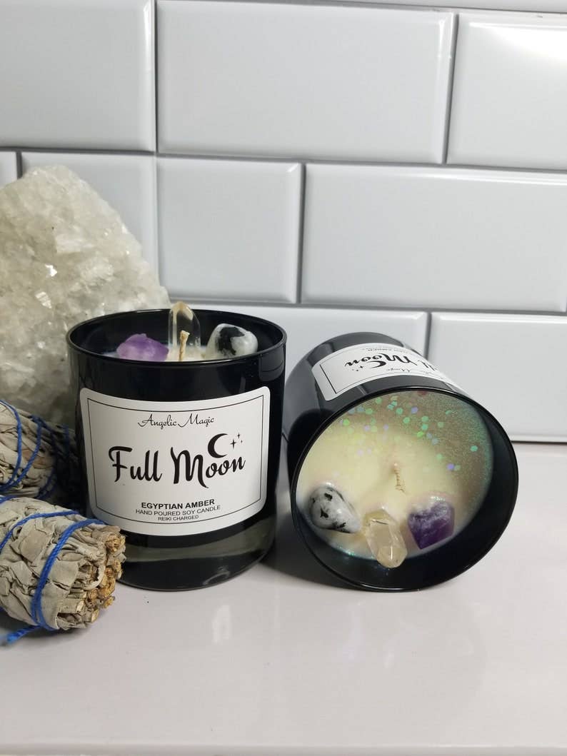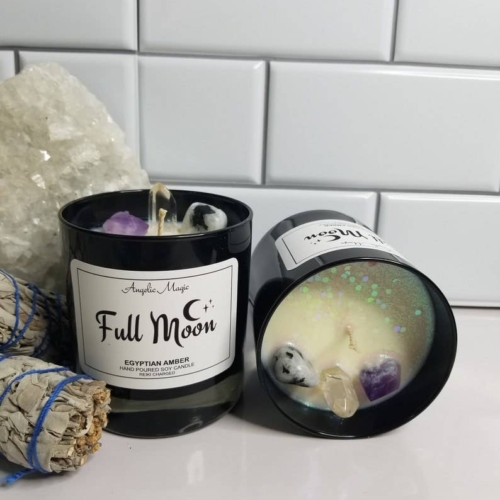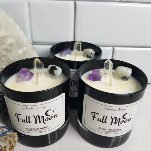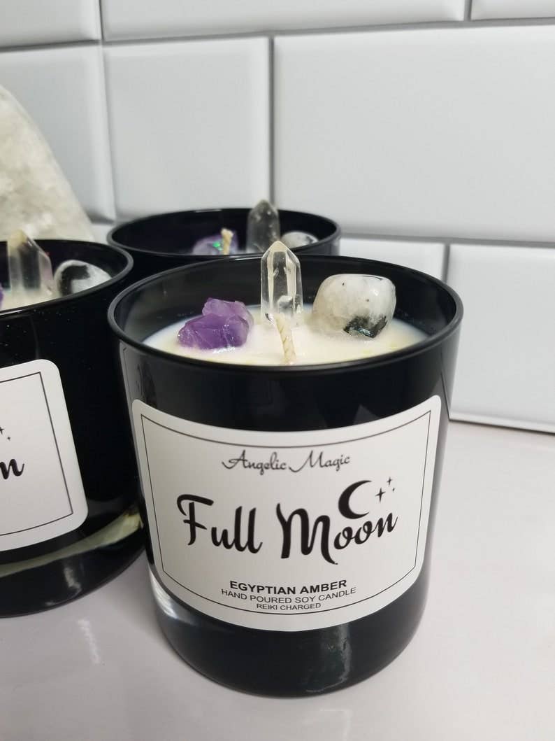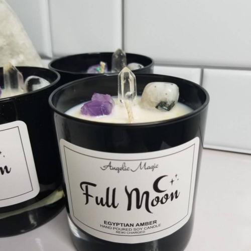 100% Natural Soy Wax100% Natural Cotton Wick11oz Glass Jar ( no Lid) Certified Non -Toxic Essential & Fragrance OilsReiki ChargedCrystals Amethyst, Quartz, MoonstoneScent – Egyptian AmberTop-Ozone, JasmineMiddle-Tonka Bean, Patchouli, Sandalwood, LeatherBase-Powder, Light Musk, Dark Musk, AmberThis Full Moon crystal soy candle with quart, amethyst and moonstone is a favorite in our store. Plunge into the healing energy of natural crystals surrounding you by emitting a heavenly scent. Amethyst is known as the “wisdom stone” and works as a natural meditation aid. Quartz is a stone for purification and clearing away negativity. Moonstone has been called the “Magic Mirror Stone”. It promotes faithfulness, love and beauty. The light bounces off the shimmering surface of this stone to reflect truth back to its source.