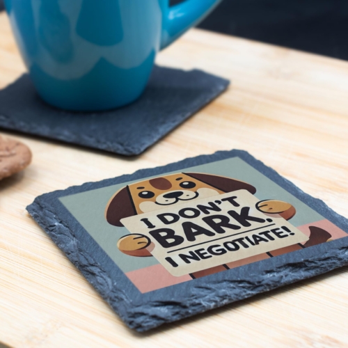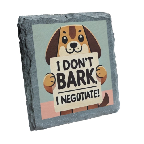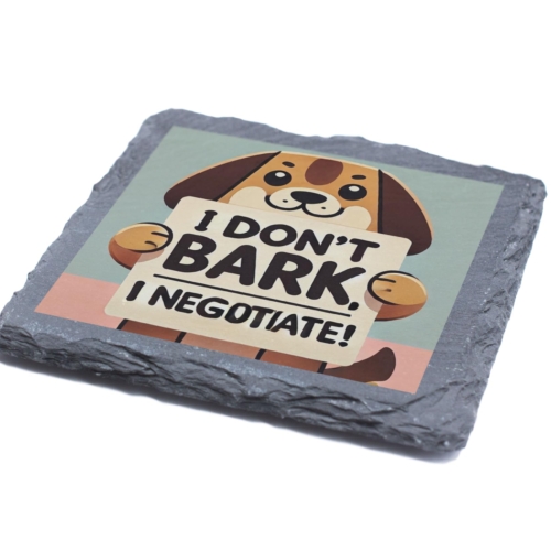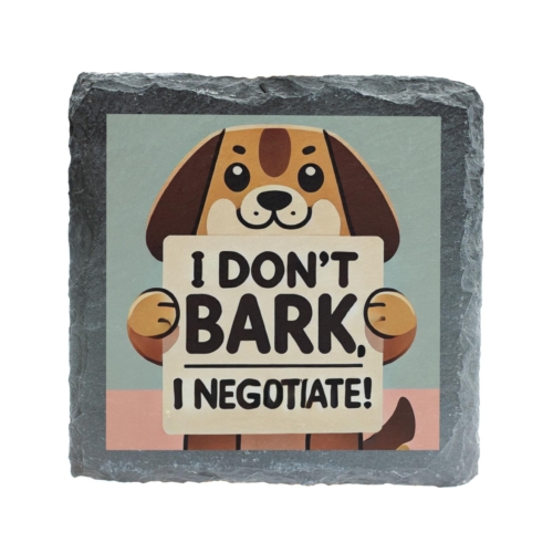 Bring a smile to your face with this Funny Dog Quote Slate Coaster. Featuring a charming design of a cute dog proudly declaring, “I Don?t Bark, I Negotiate,” this coaster is a delightful addition to any home. Perfect for protecting your surfaces while showcasing your love for dogs and humor, it is crafted from durable natural slate for long-lasting quality. Whether you’re sipping on your morning coffee or hosting a pet-themed party, this coaster combines practicality with personality. It?s an excellent gift choice for birthdays, holidays, or any occasion for the dog lovers in your life. Add a touch of fun and functionality to your space with this unique coaster! Premium Quality Slate: Made from durable natural slate, this coaster is designed to protect your surfaces from spills while adding a unique charm to your home. Adorable Dog Design: Features a cute dog illustration holding the playful quote “I Donât Bark, I Negotiate,” perfect for dog lovers and humor enthusiasts. Non-Slip and Heat-Resistant: Designed to stay securely in place while accommodating both hot and cold drinks. Perfect Gift for Dog Lovers: A thoughtful and humorous gift for friends, family, or colleagues who adore dogs and witty home accessories. Versatile Home Décor: Ideal for any kitchen, living room, or office space, adding personality and functionality to your décor.