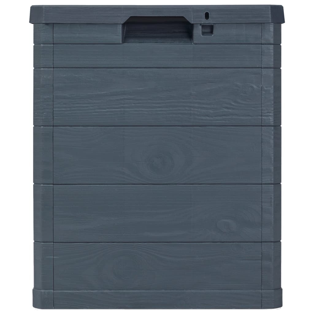Highlights Garden Storage Box 23.8 gal Anthracite Details This stylish storage box presents an ideal solution for decluttering your house. Keep it tidy by storing away your cushions, pillows, blankets, toys, and other items you’d like to keep out of sight. It can also be used as a toolbox thanks to its solid construction.Material consists of durable, weather-resistant plastic, making this storage box perfect for both indoor and outdoor use. The wooden texture design gives the garden storage box an understated yet timeless feel, which fits well in any decor setting.This storage box is easy to assemble.Color: AnthraciteMaterial: Plastic (with wood texture)Dimensions: 16.7″ x 17.3″ x 19.7″ (L x W x H)Capacity: 23.8 galLockable (lock is not included)Suitable for both outdoor and indoor use