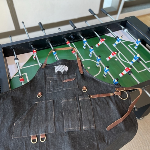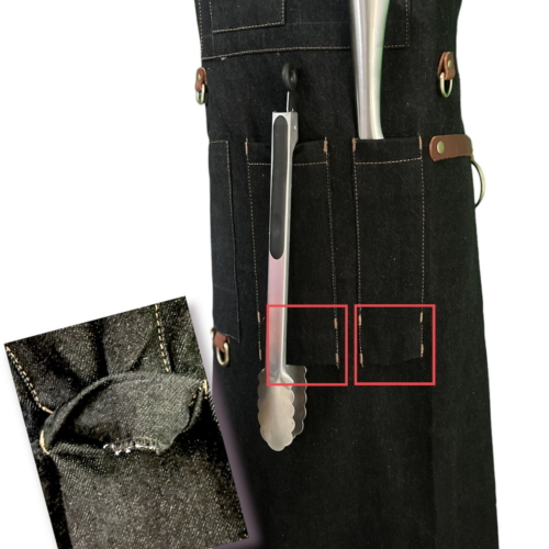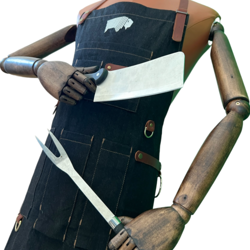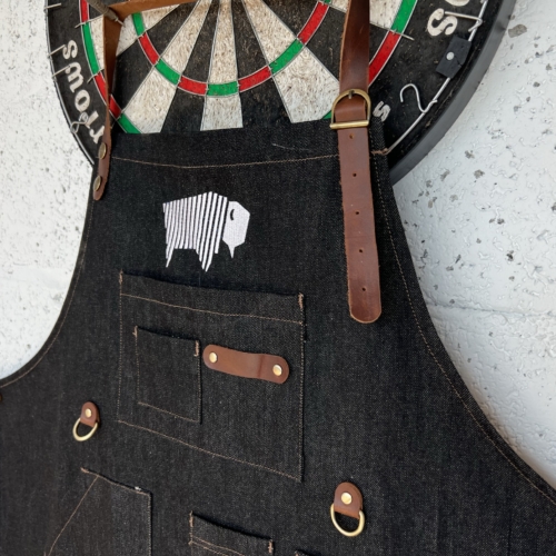 Heavy denim apron with utility pockets. Adjustable neck and waist straps.
