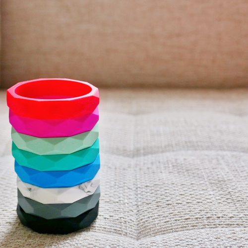 These modern, bright and fun geometric bangles not only look great, they are the perfect indestructible on-to-go teether that you always have to hand.