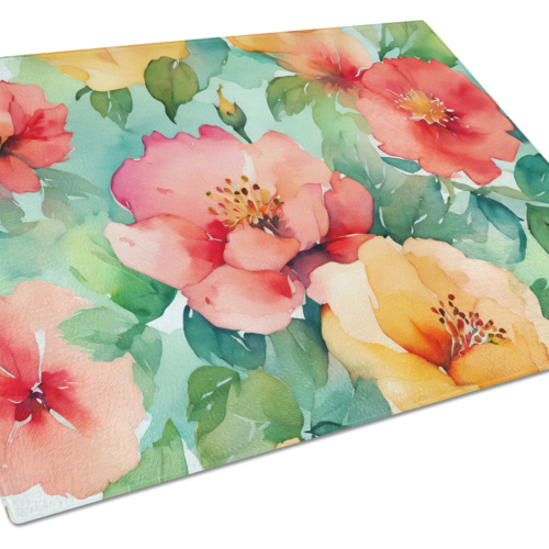 Glass Cutting Board featuring breed specific Georgia Cherokee Rose artwork. Introduce your kitchen to the vibrant, large Decorative Glass Cutting Board from Caroline’s Treasures. Crafted from resilient tempered glass, this board is not only a utilitarian necessity but also a colorful art piece. With its generous dimensions of 15 inches in height and 12 inches in length, it offers ample space for all your cutting needs. Every piece showcases captivating artwork from distinguished artists, bringing an aesthetic edge to your kitchen. Beyond its attractive design, this cutting board ensures your countertop stays pristine and unscathed, owing to its heat-resistant properties. Engineered with user convenience in mind, it features non-skid feet for stability, and rounded corners for additional safety. Its robust construction renders it virtually unbreakable, guaranteeing longevity. The board comes with protective feet bumpers, maintaining its position during use. This product is recommended to be hand washed only. Proudly printed and assembled in the United States, this cutting board exemplifies superior craftsmanship. With Caroline’s Treasures’ Decorative Glass Cutting Board, you’re investing in a blend of functionality and artistic flair.